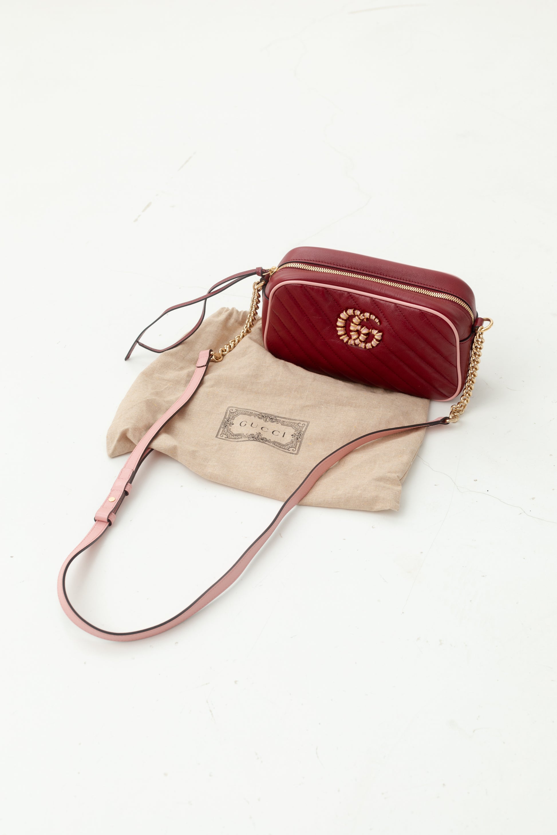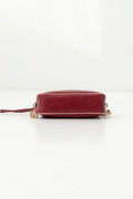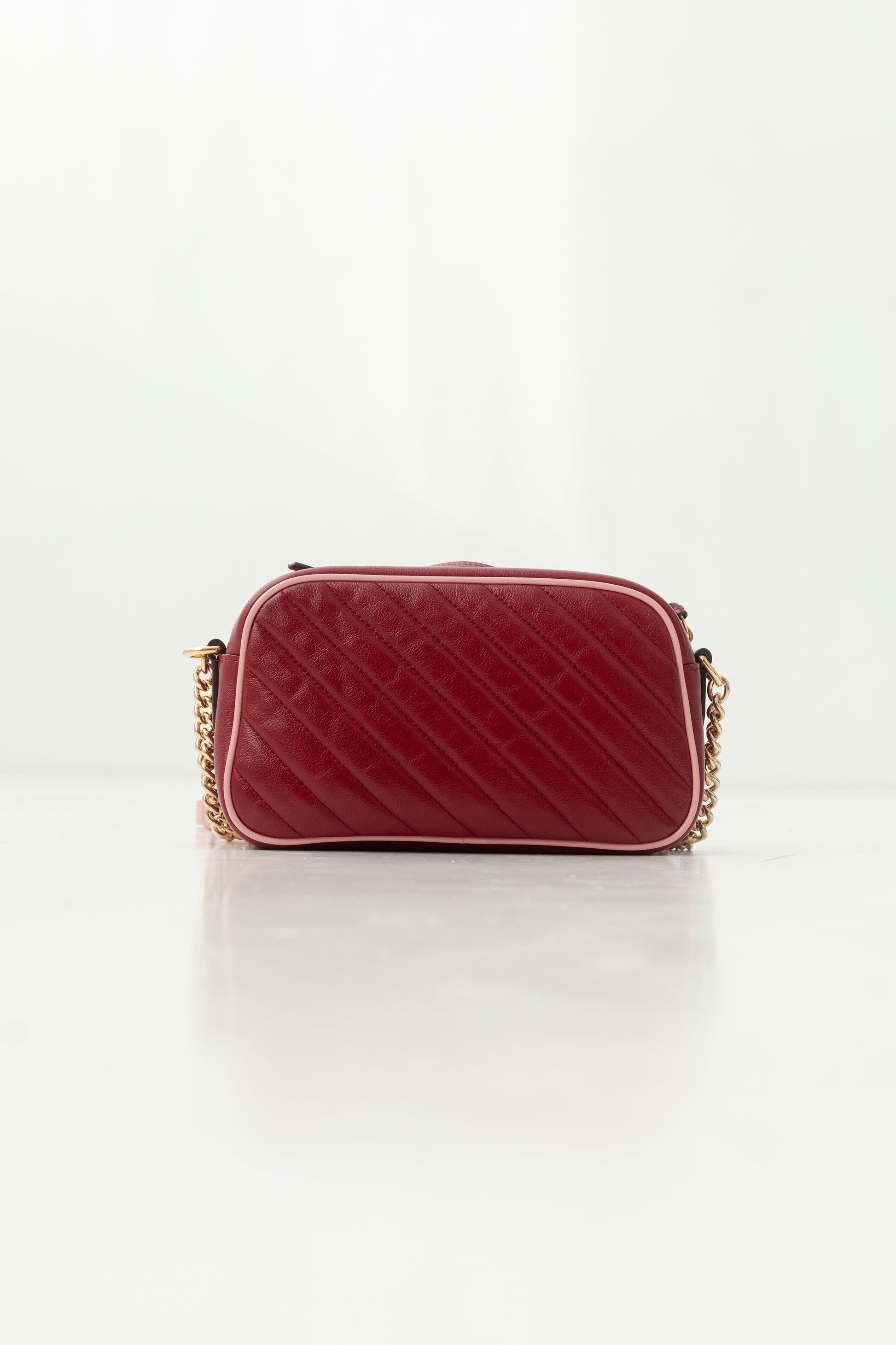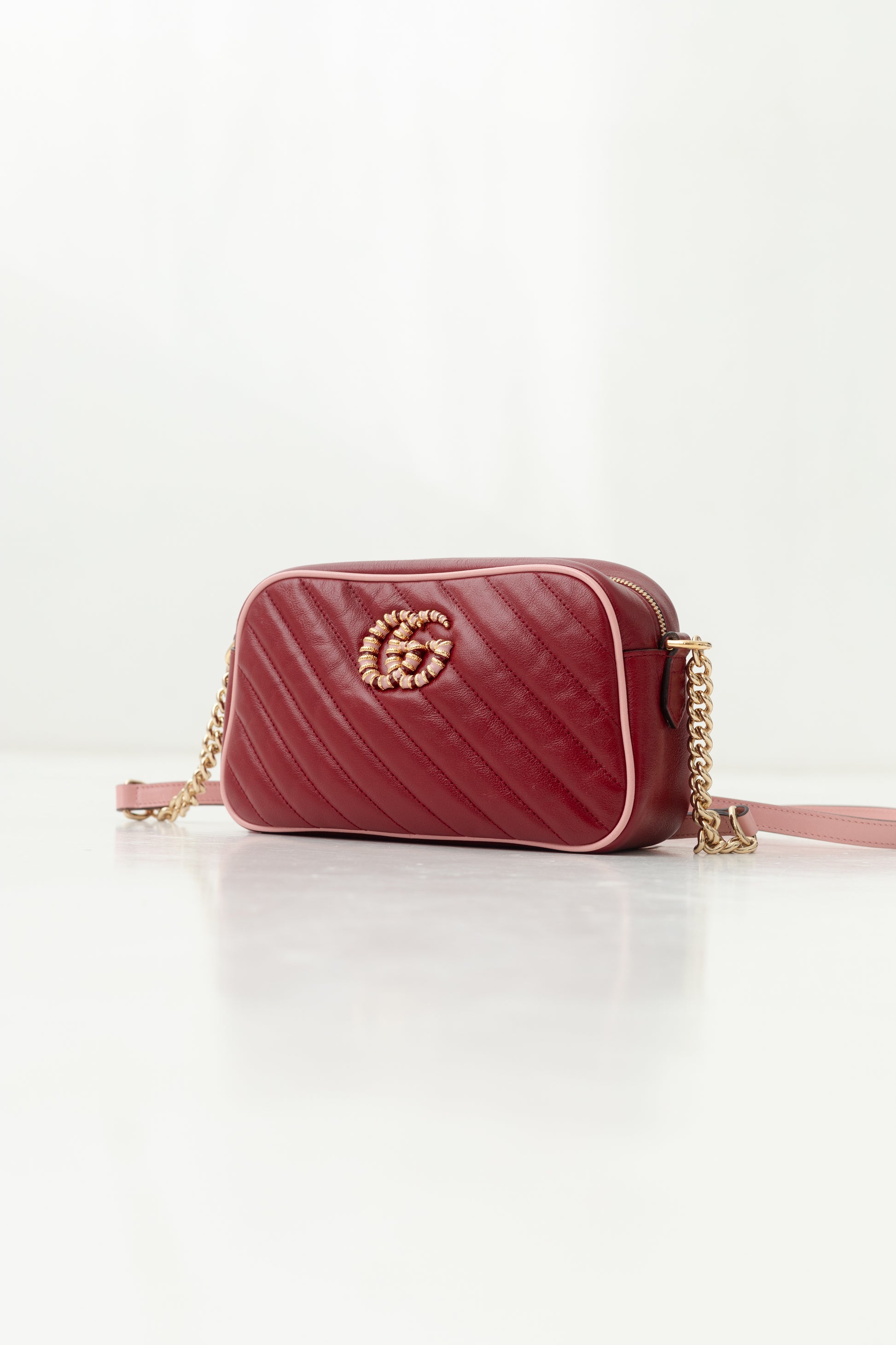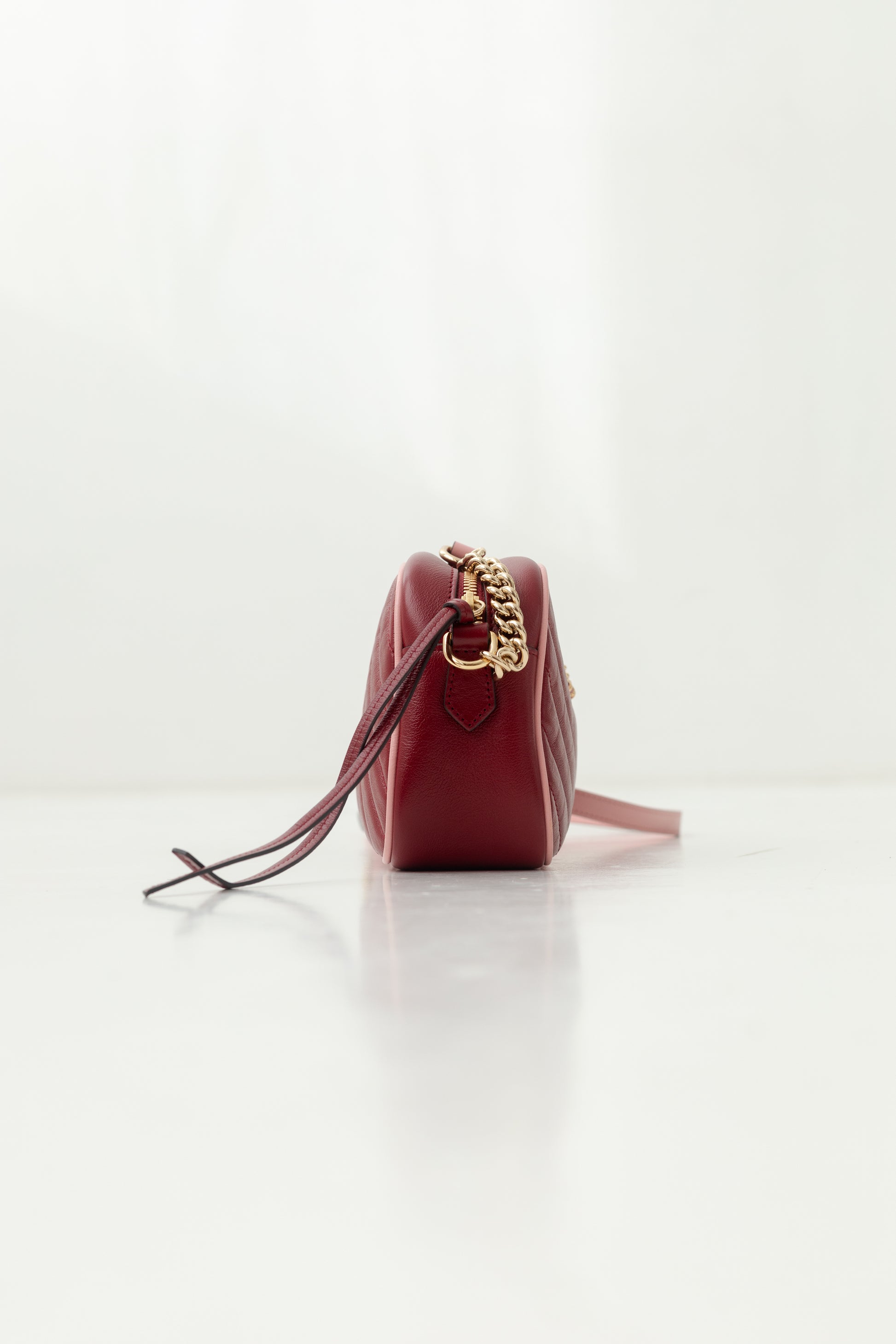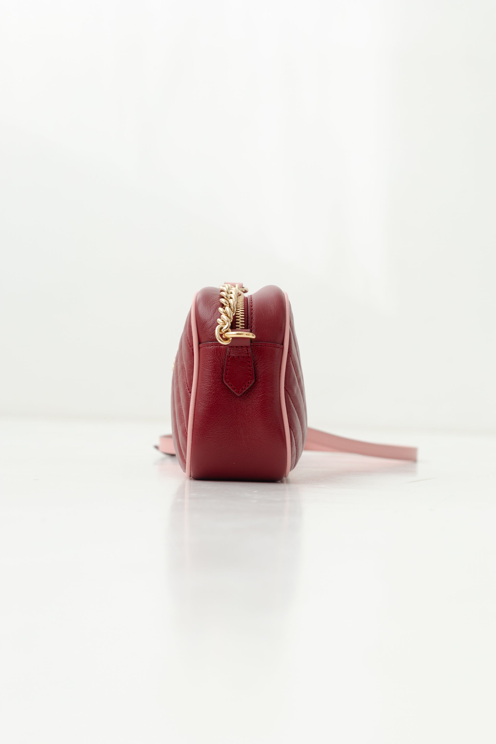 Couro calfskin vermelho com acabamento matelassê e aplicação em GG