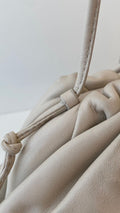 Alça longa e fina em couro, ajustável por nós, permitindo uso no ombro ou tiracolo