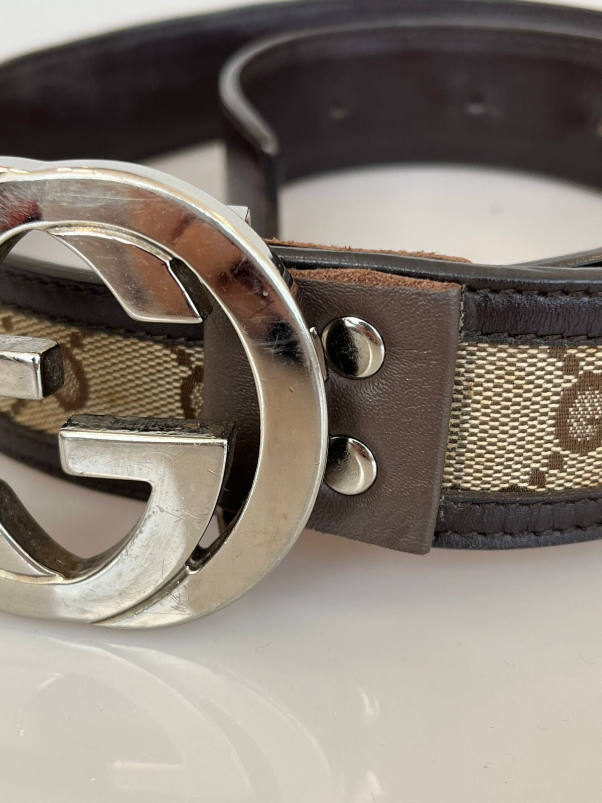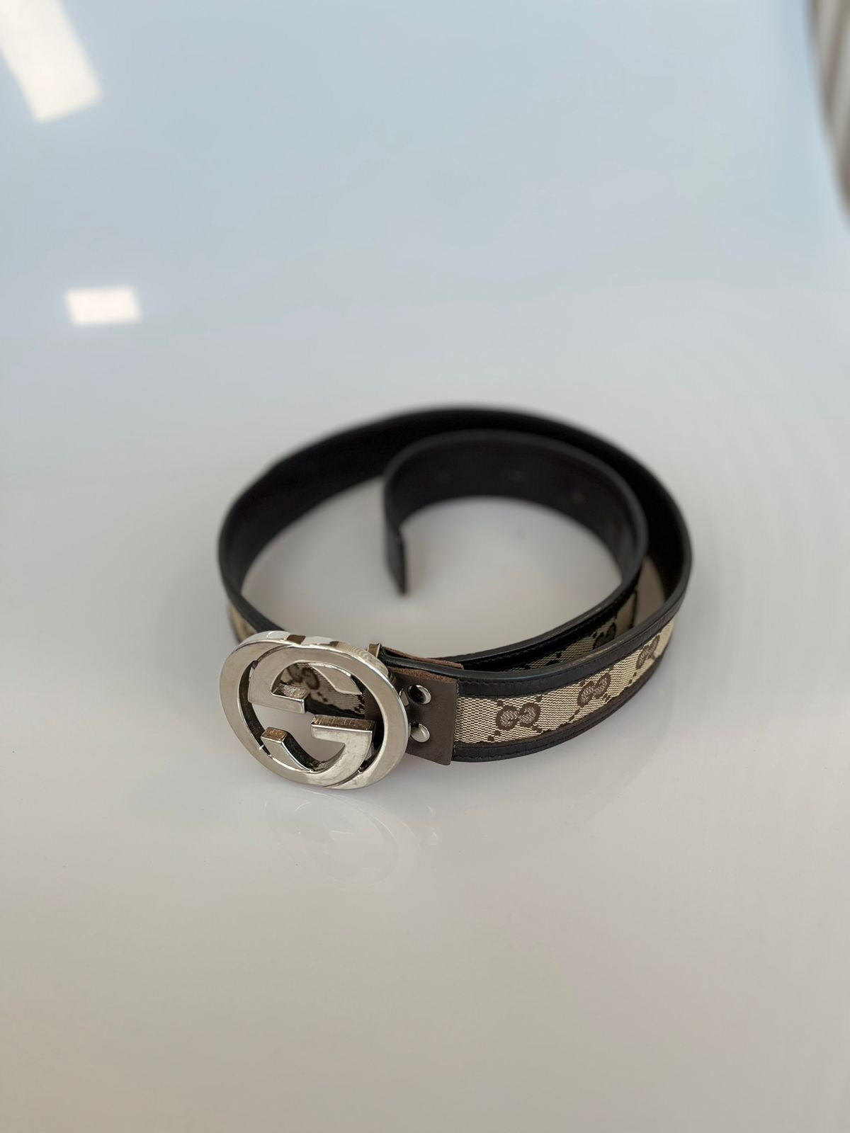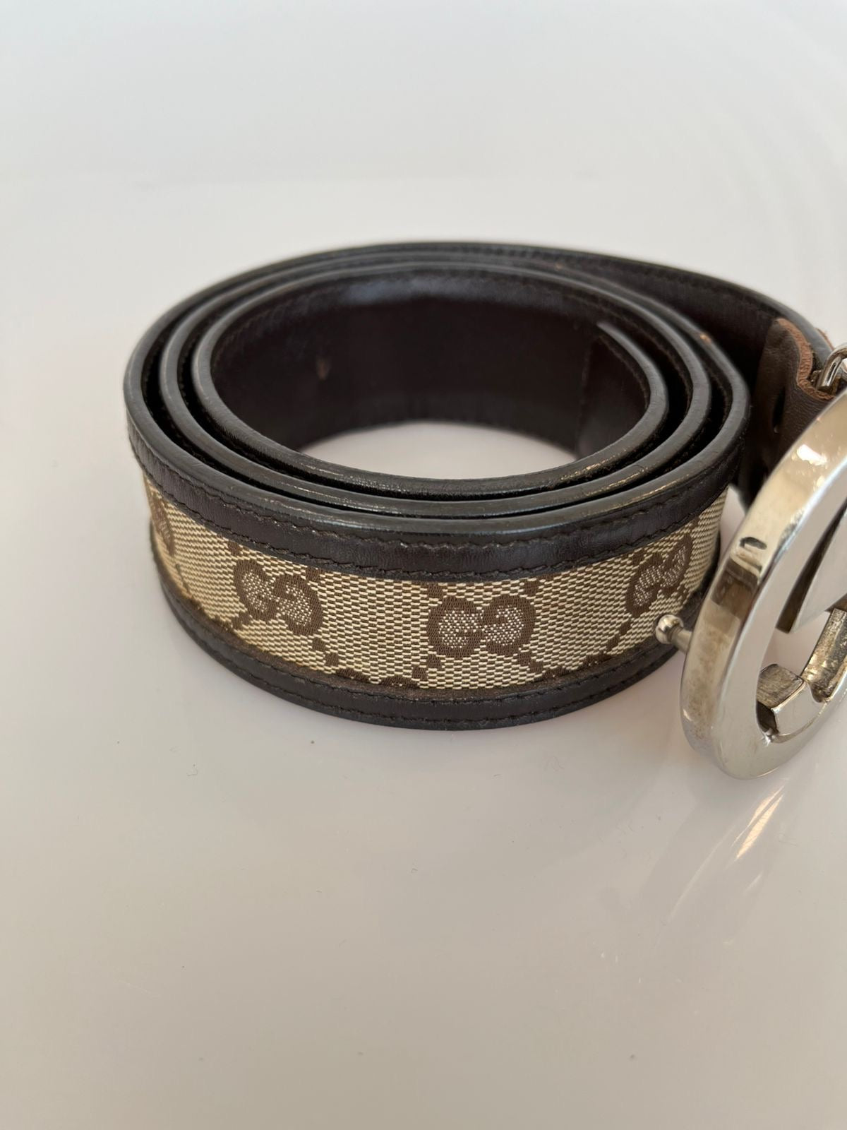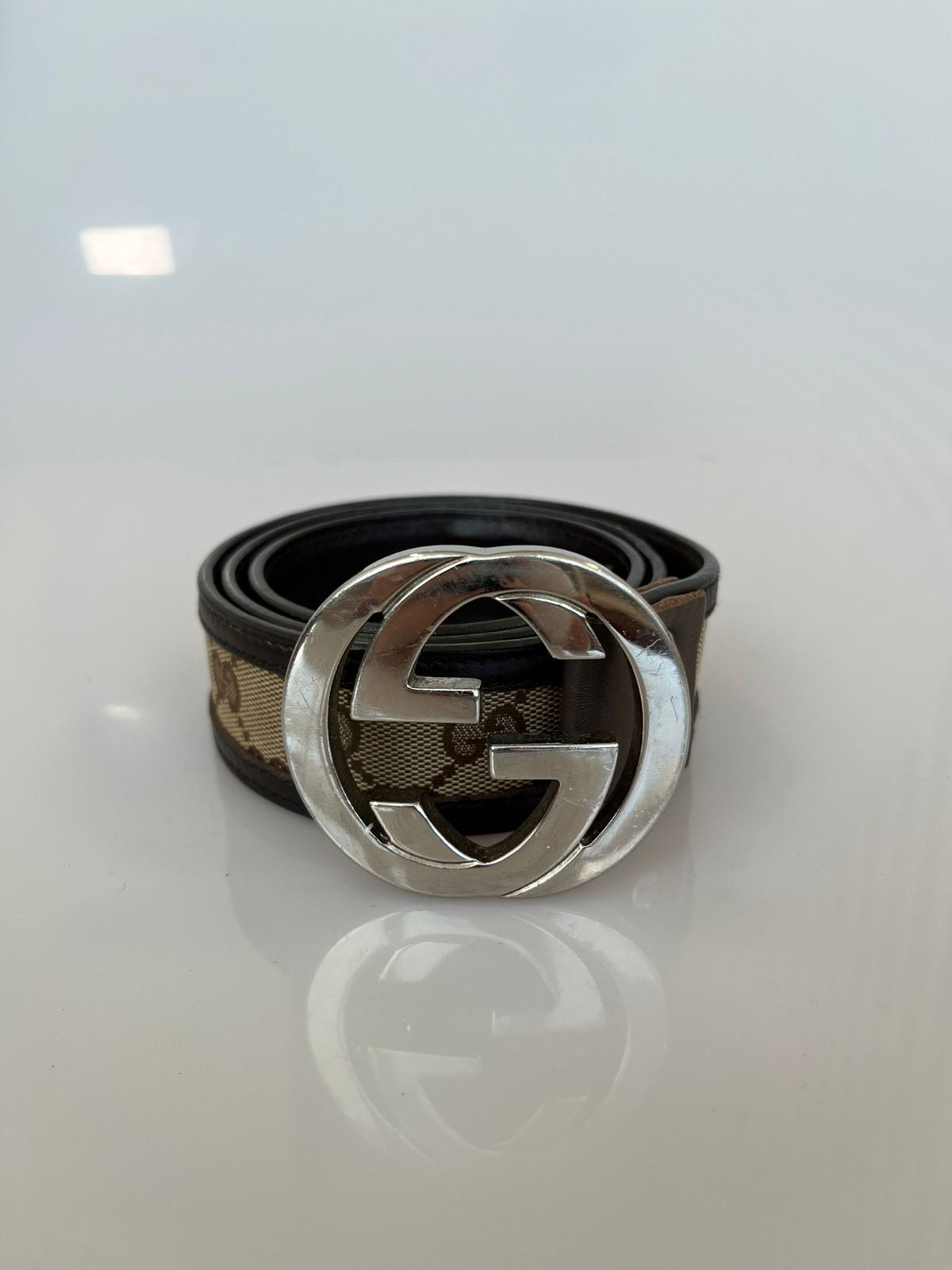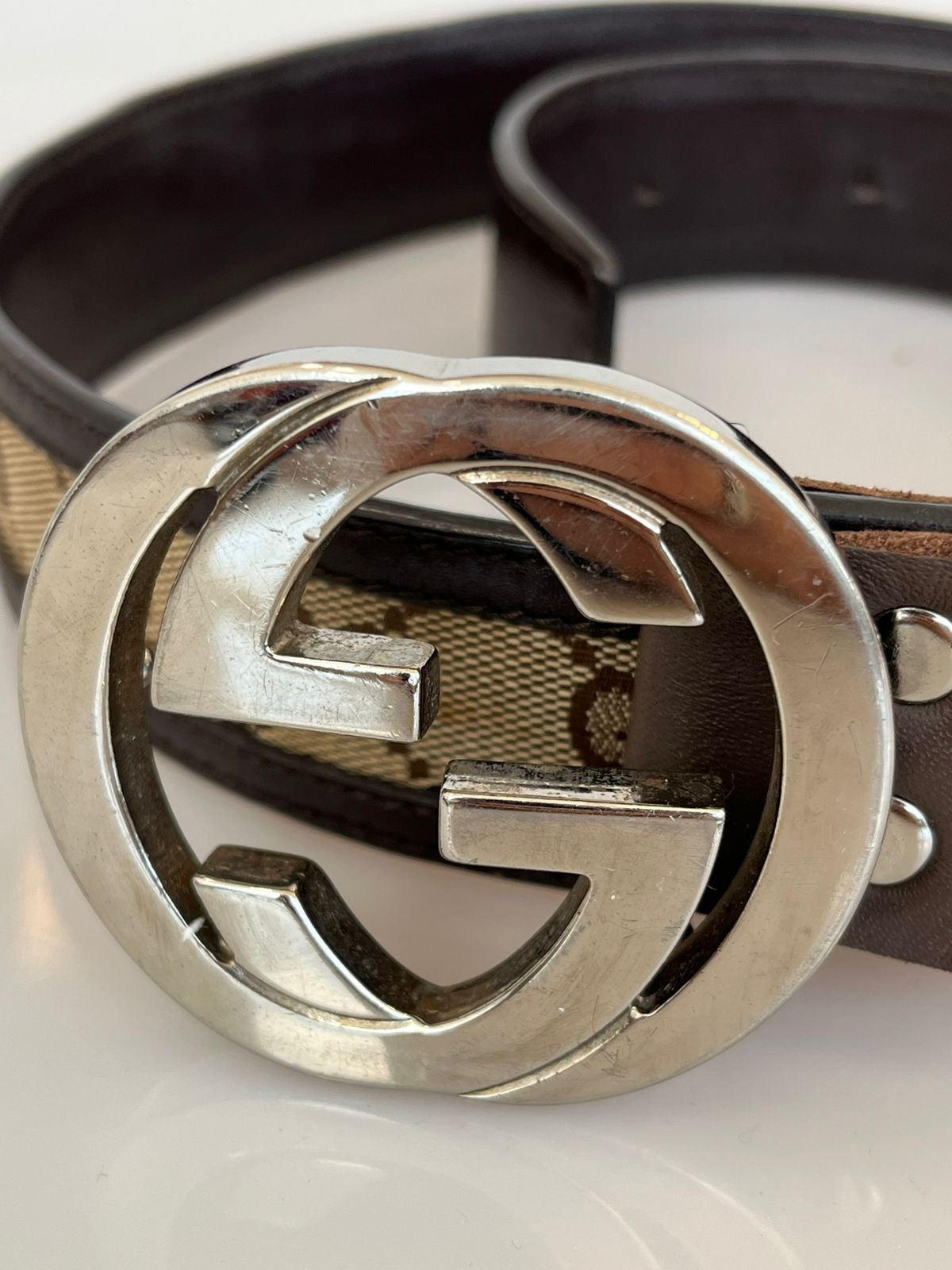Fivela GG grande em metal prateado, característica e icônica da marca.