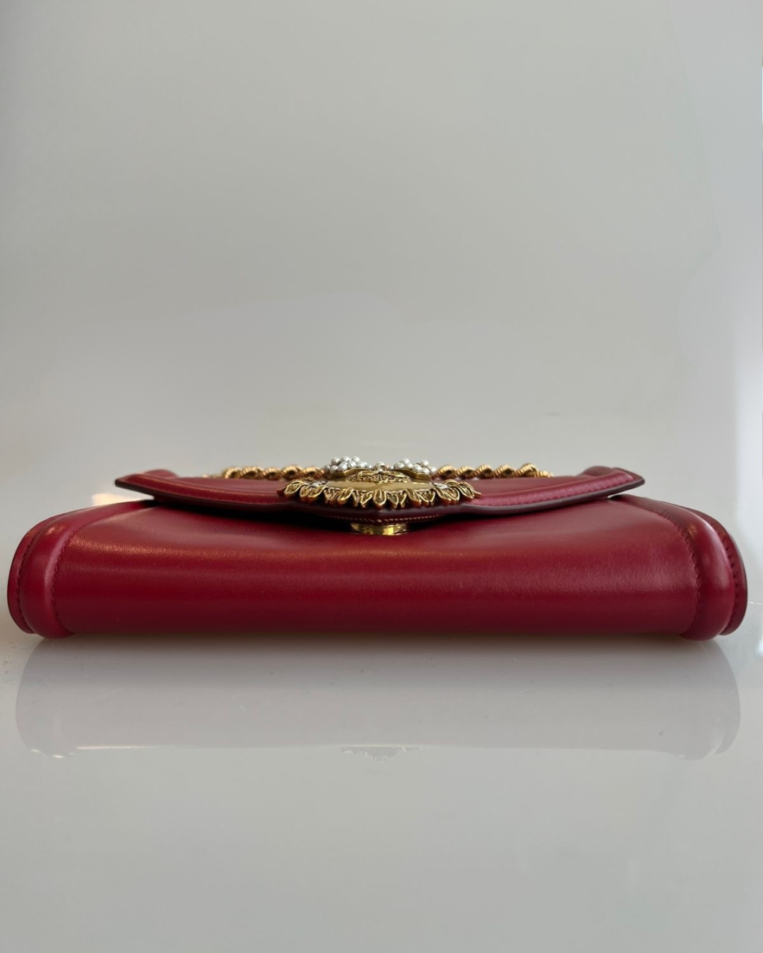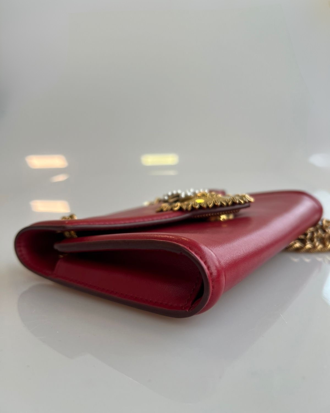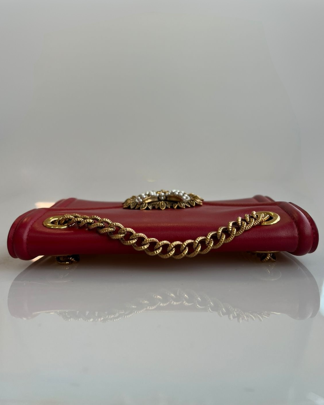 Couro macio e estruturado, com acabamento sofisticado. O destaque fica por conta do icônico fecho Sacred Heart em metal dourado, com aplicações de pérolas, assinatura da linha Devotion.
