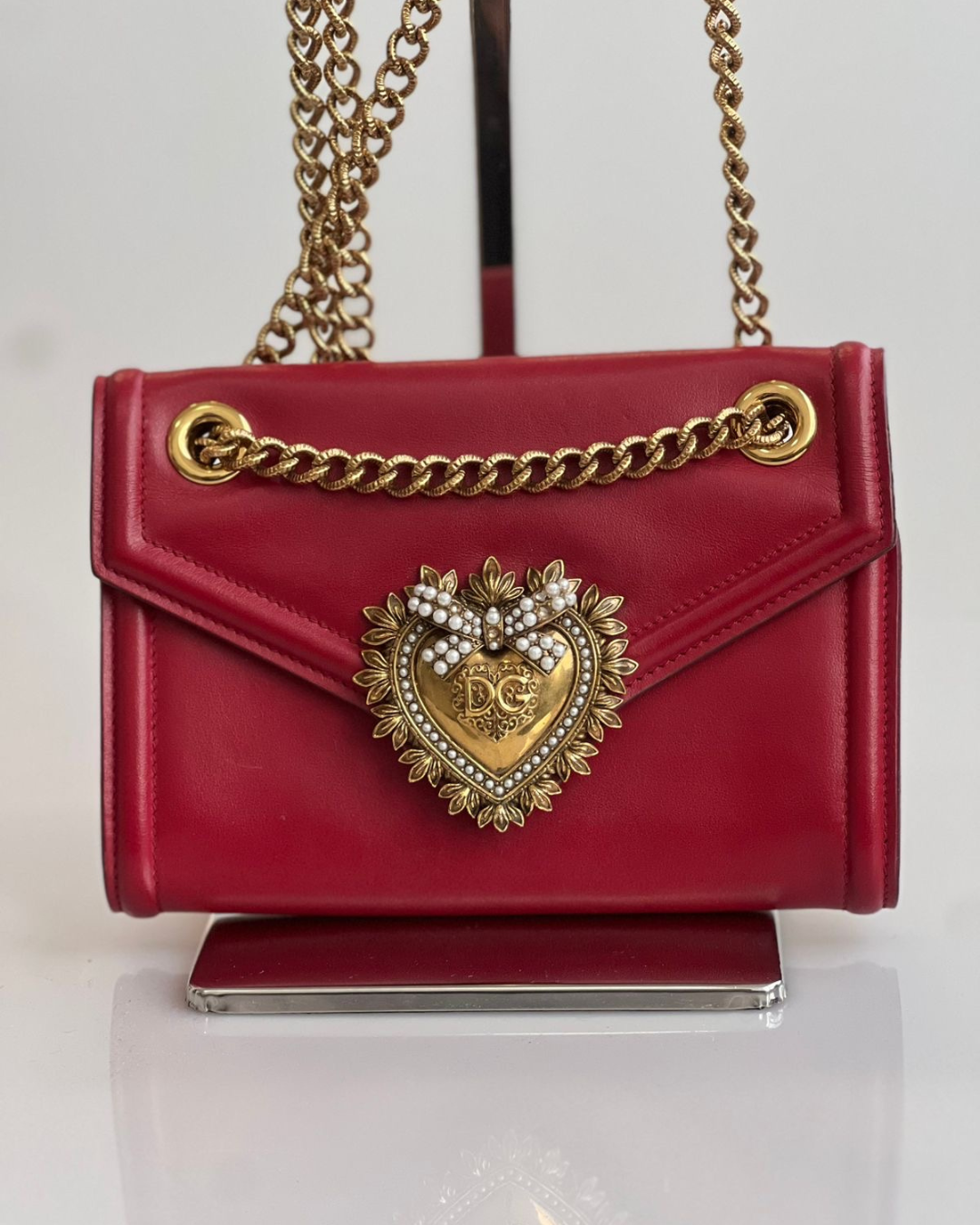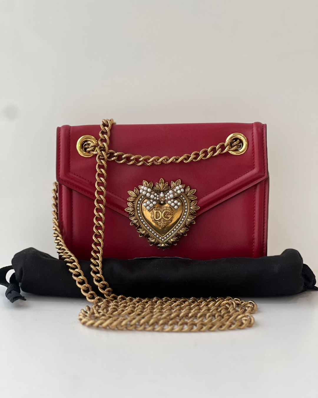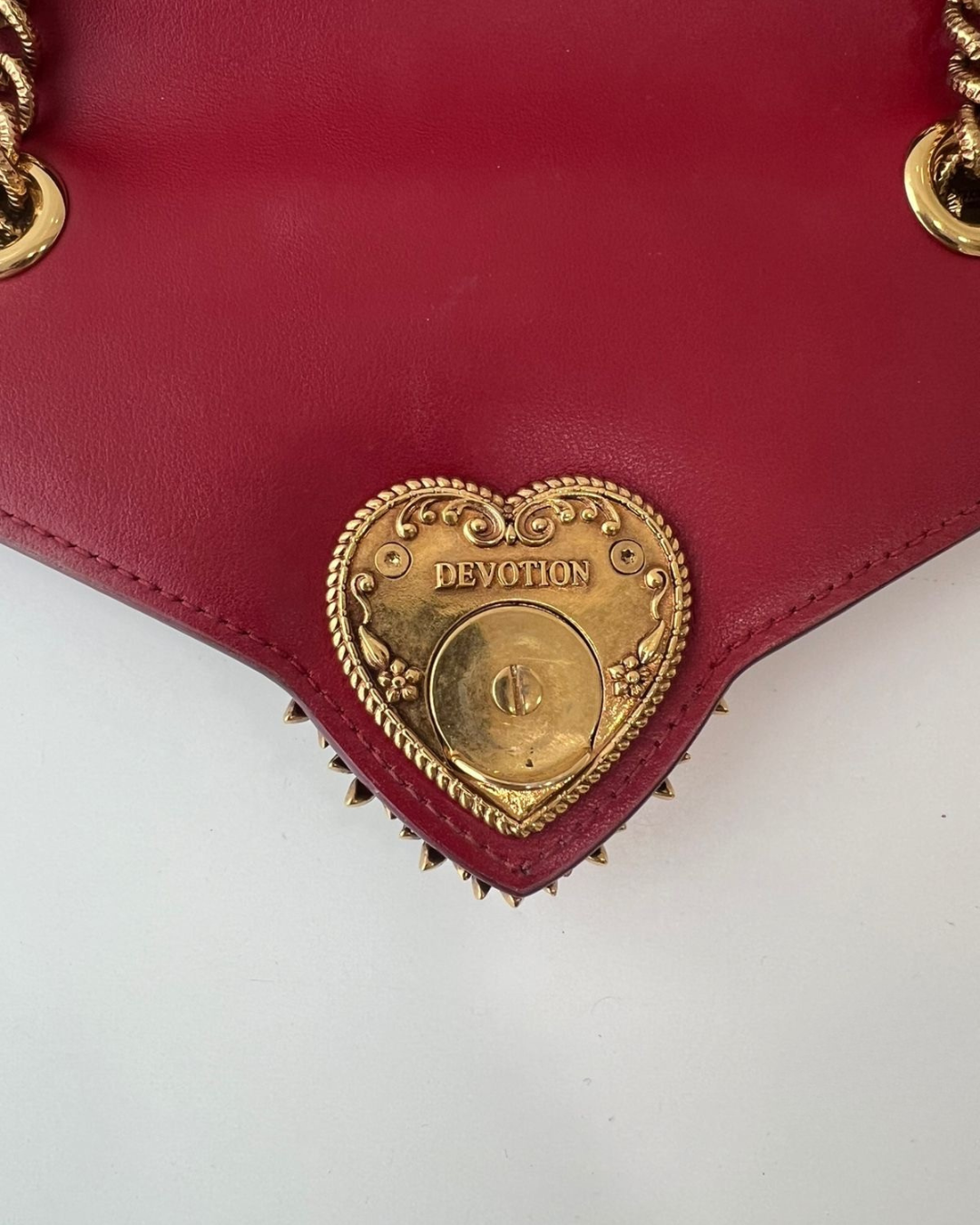 Couro macio e estruturado, com acabamento sofisticado. O destaque fica por conta do icônico fecho Sacred Heart em metal dourado, com aplicações de pérolas, assinatura da linha Devotion.