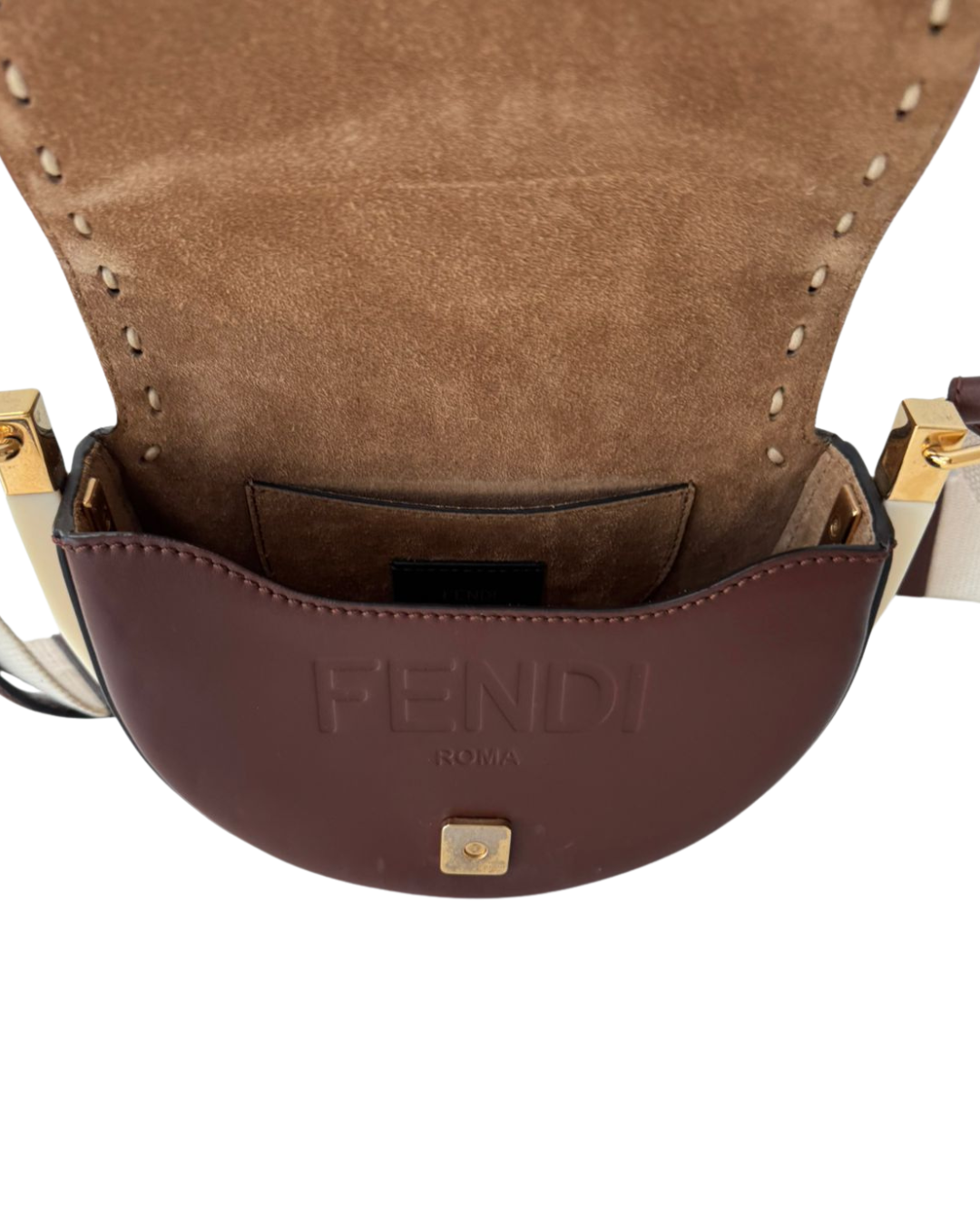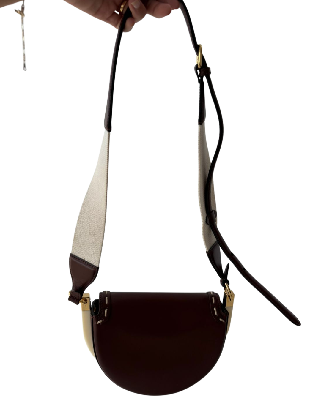 Em excelente estado, com leves sinais de uso nas extremidades. O couro está bem preservado e a alça em tecido apresenta leve desgaste. Leves sinais de uso nas ferragens e no botão de encaixe.