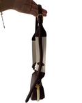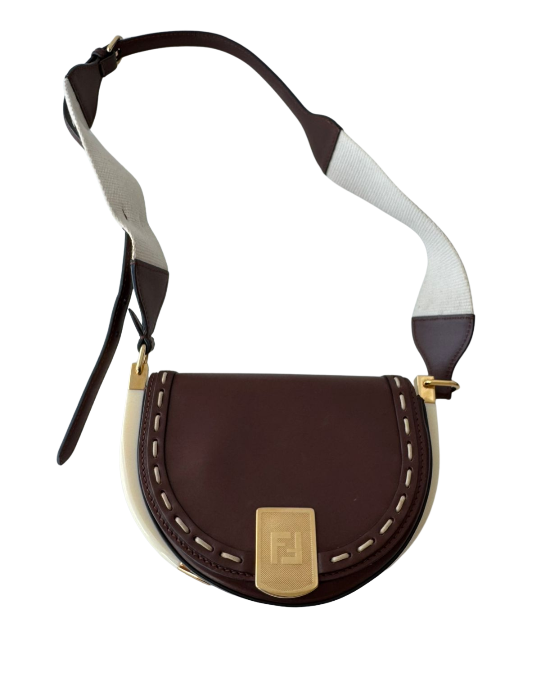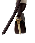 Alça longa ajustável em tecido e couro, com detalhes dourados