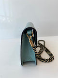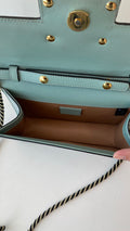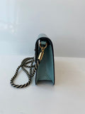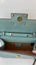 Ferragens em tom prateado, com logo G frontal adornado por cristais