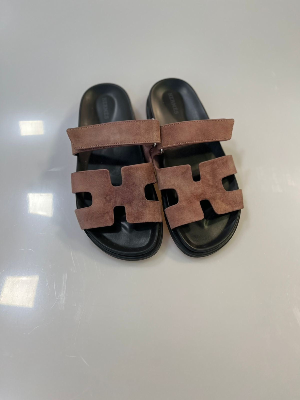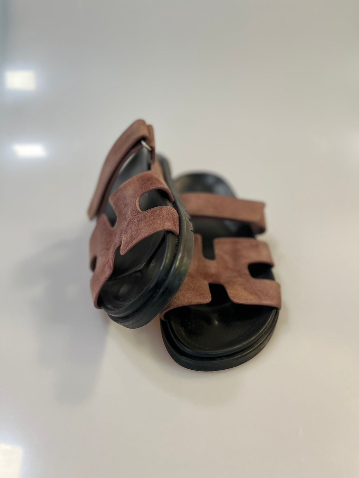 Muito bom estado. A sandália apresenta poucos sinais de uso, com a camurça ainda bem conservada. As solas estão em ótimo estado, com pouco desgaste, e a estrutura permanece firme e intacta.