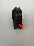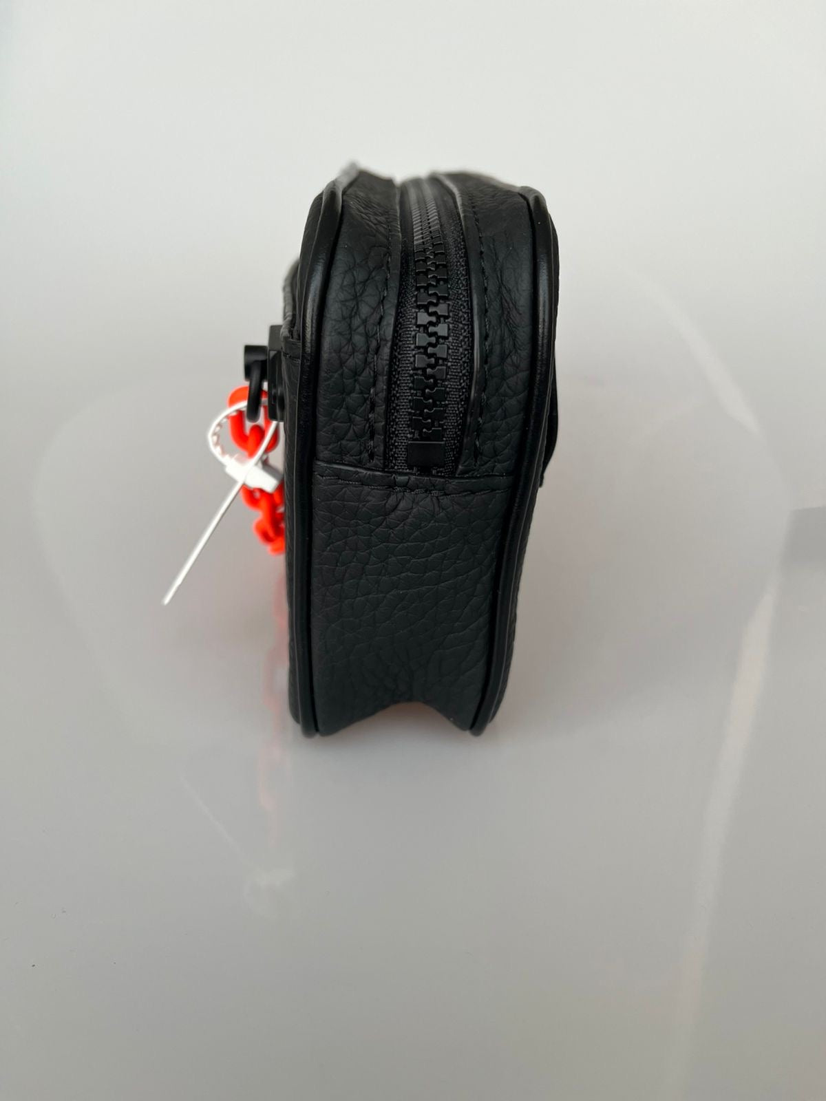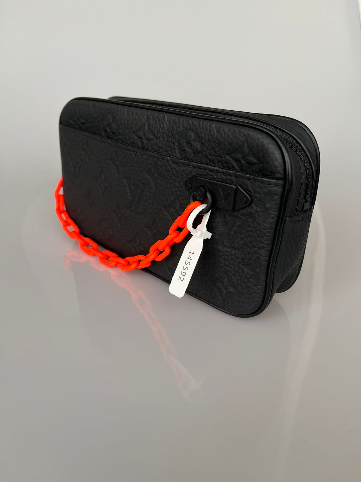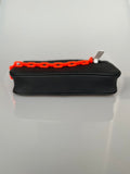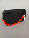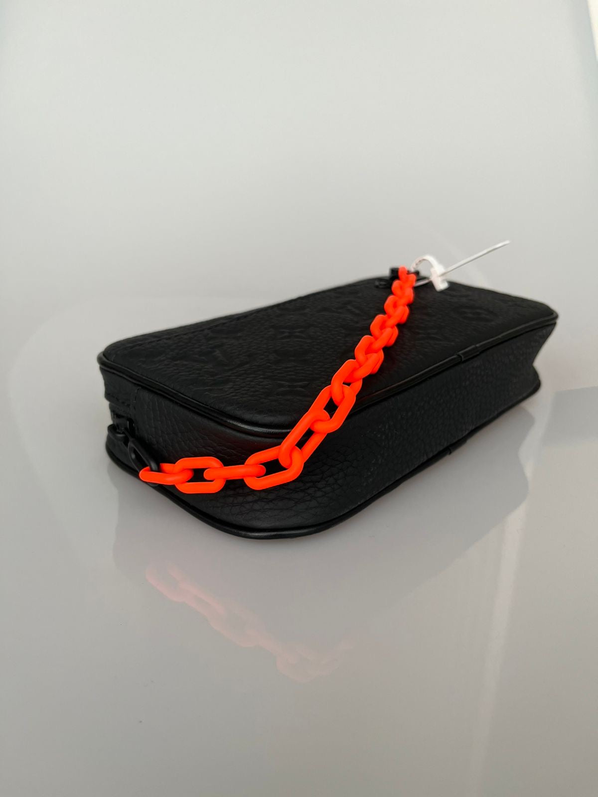 Couro Taurillon com monograma em relevo, corrente de resina laranja neon