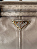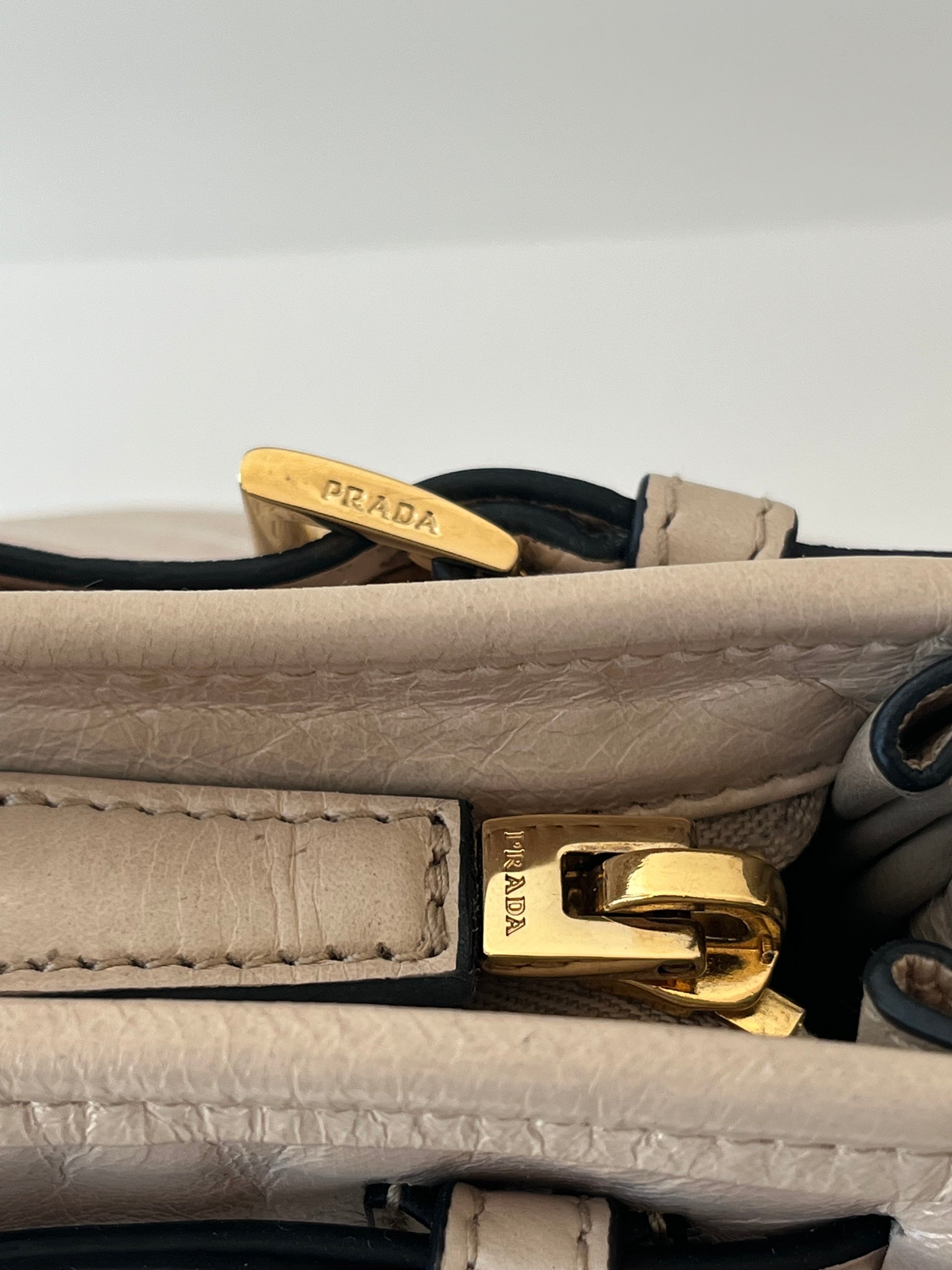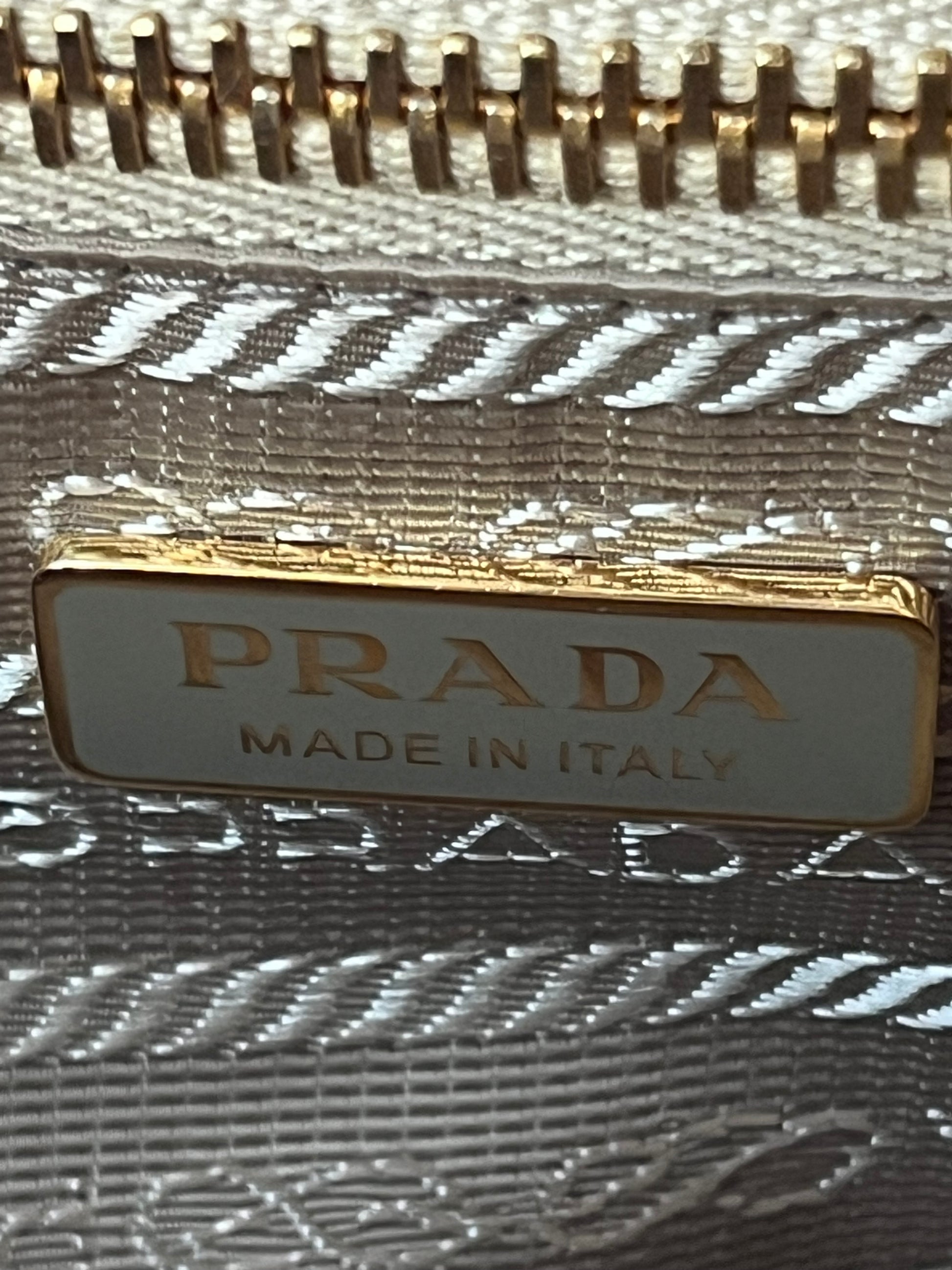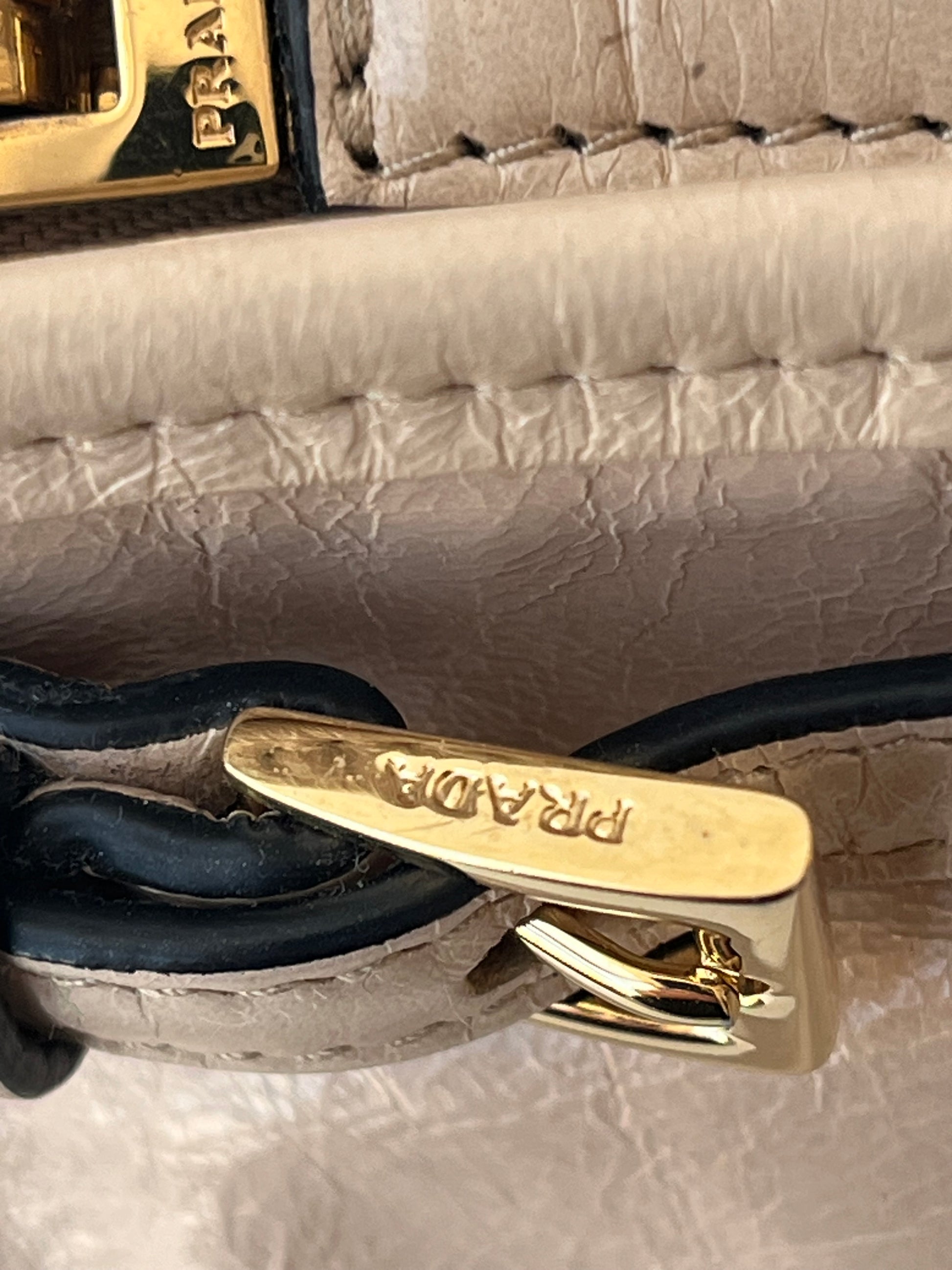Detalhes metálicos dourados, incluindo a icônica placa triangular Prada