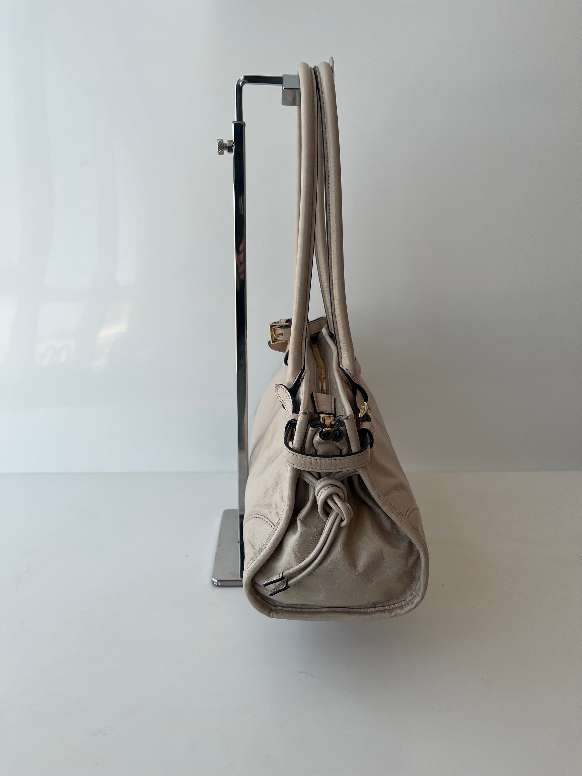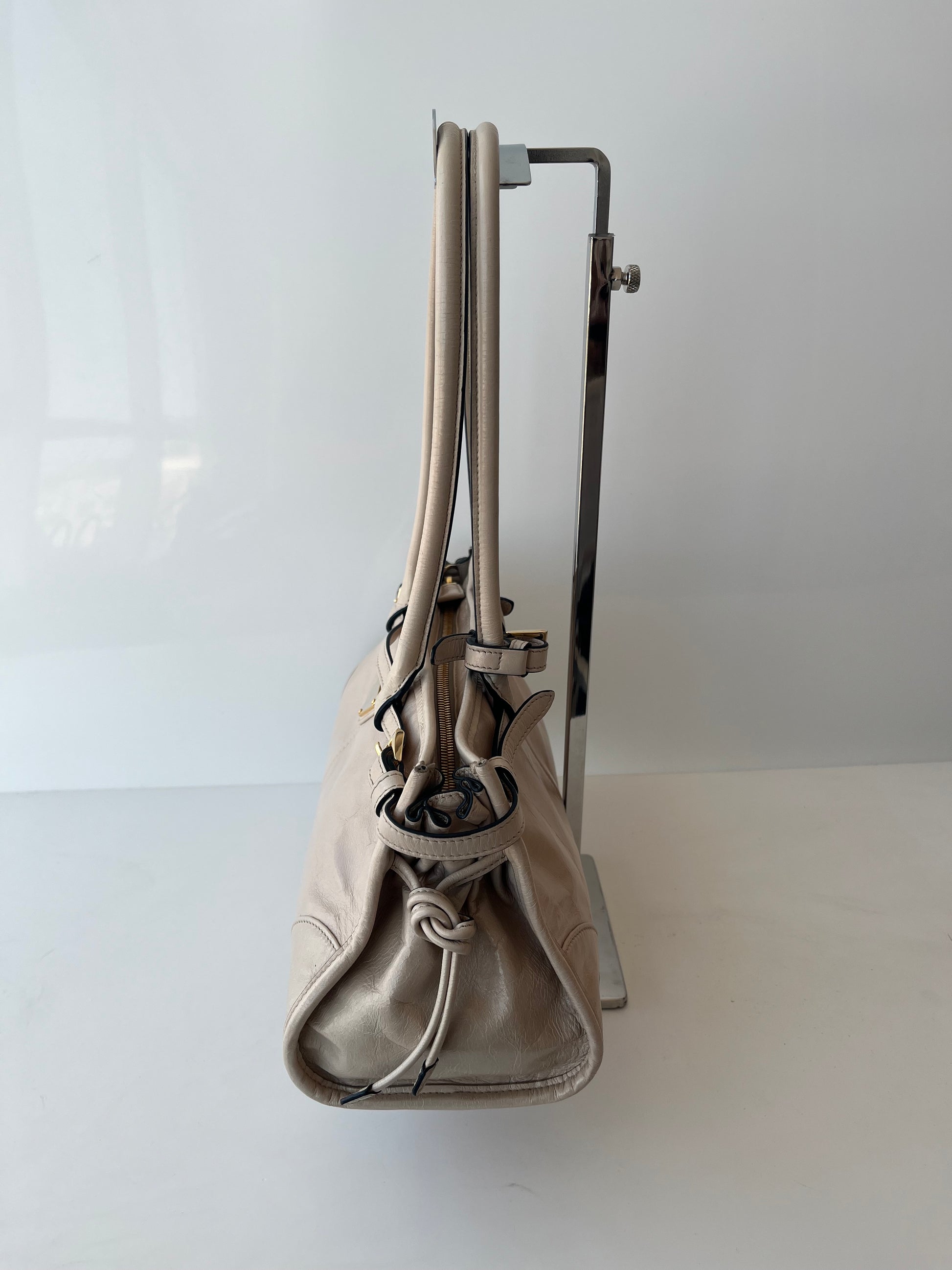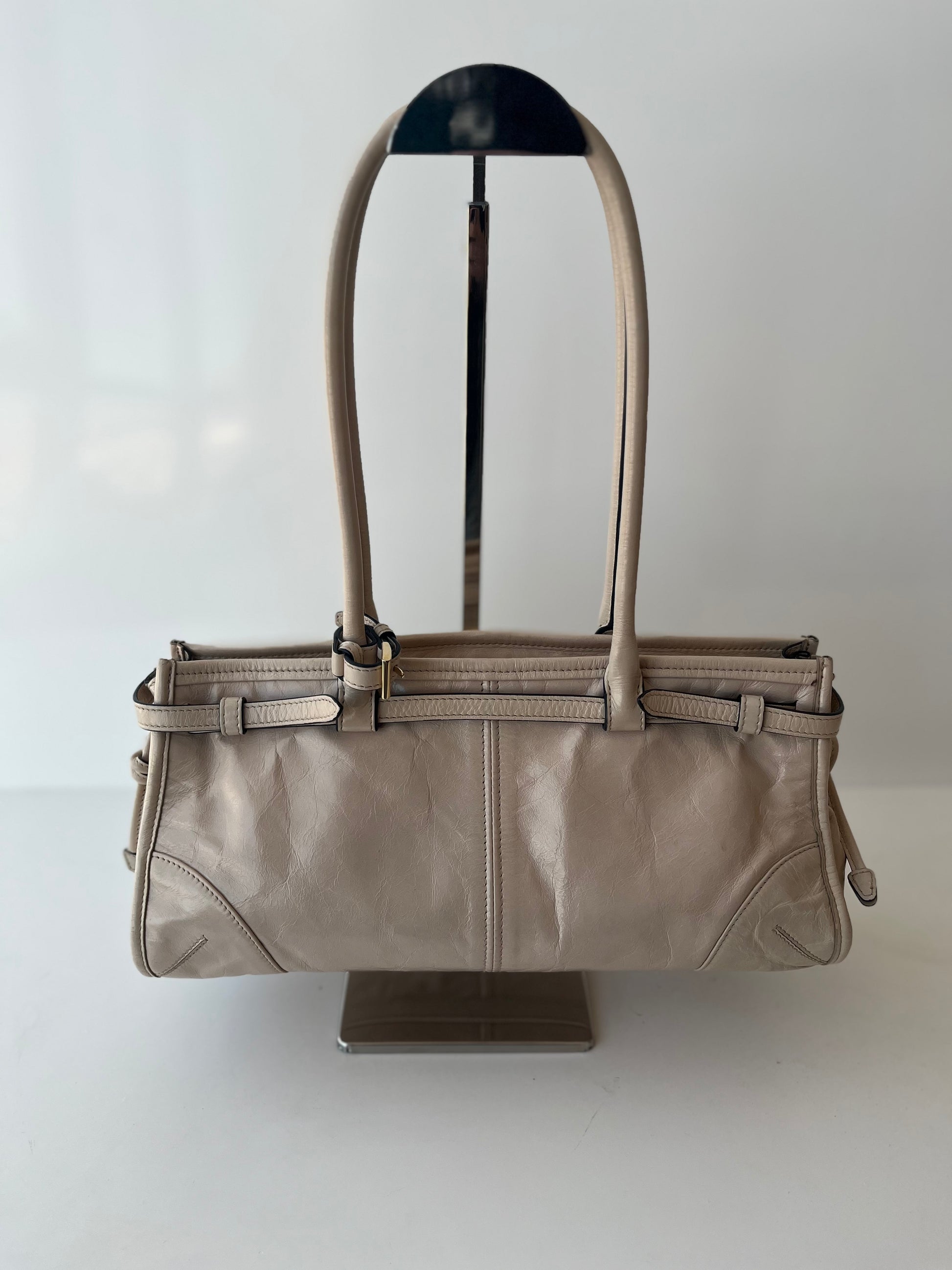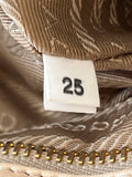 Detalhes metálicos dourados, incluindo a icônica placa triangular Prada