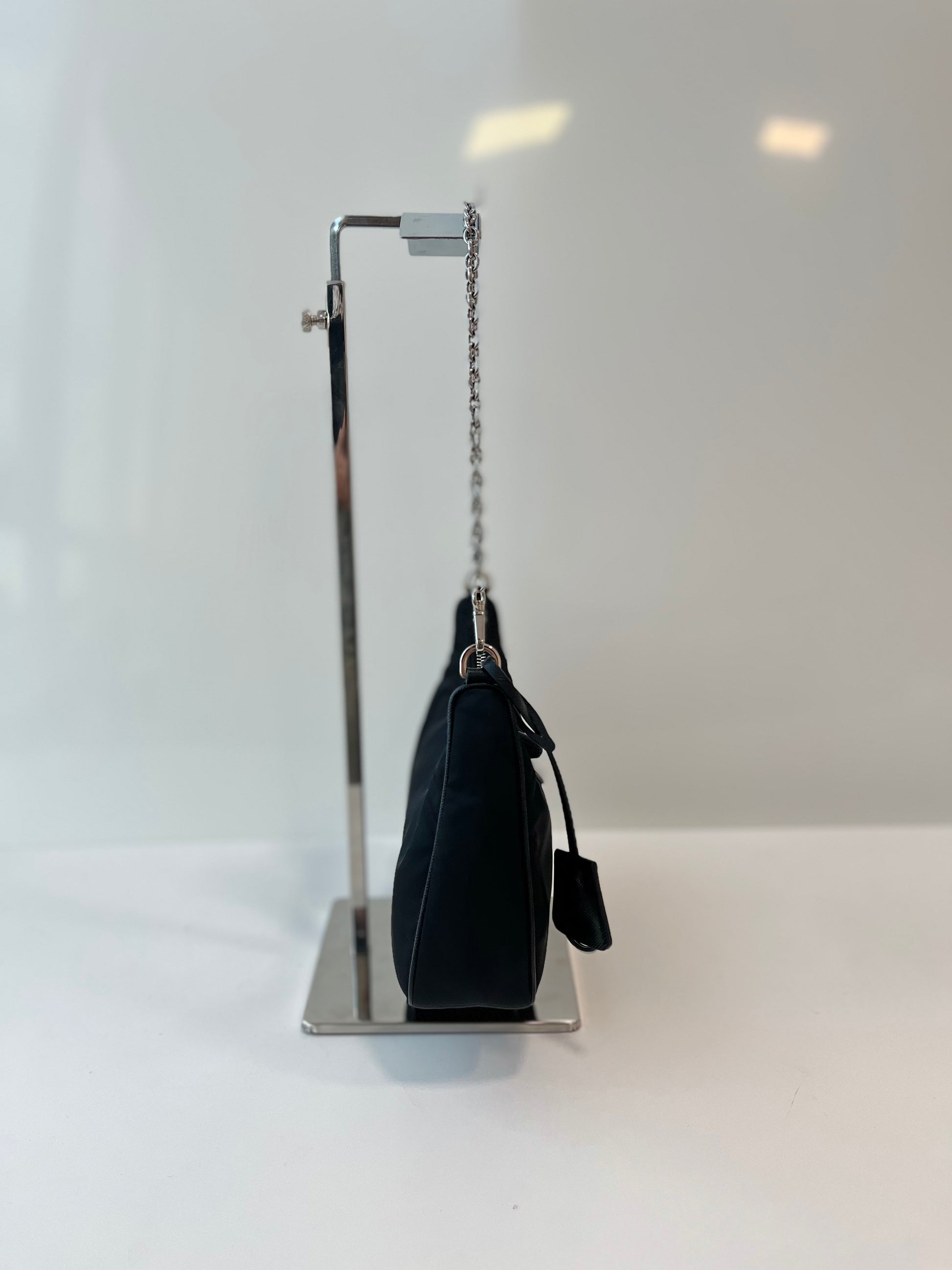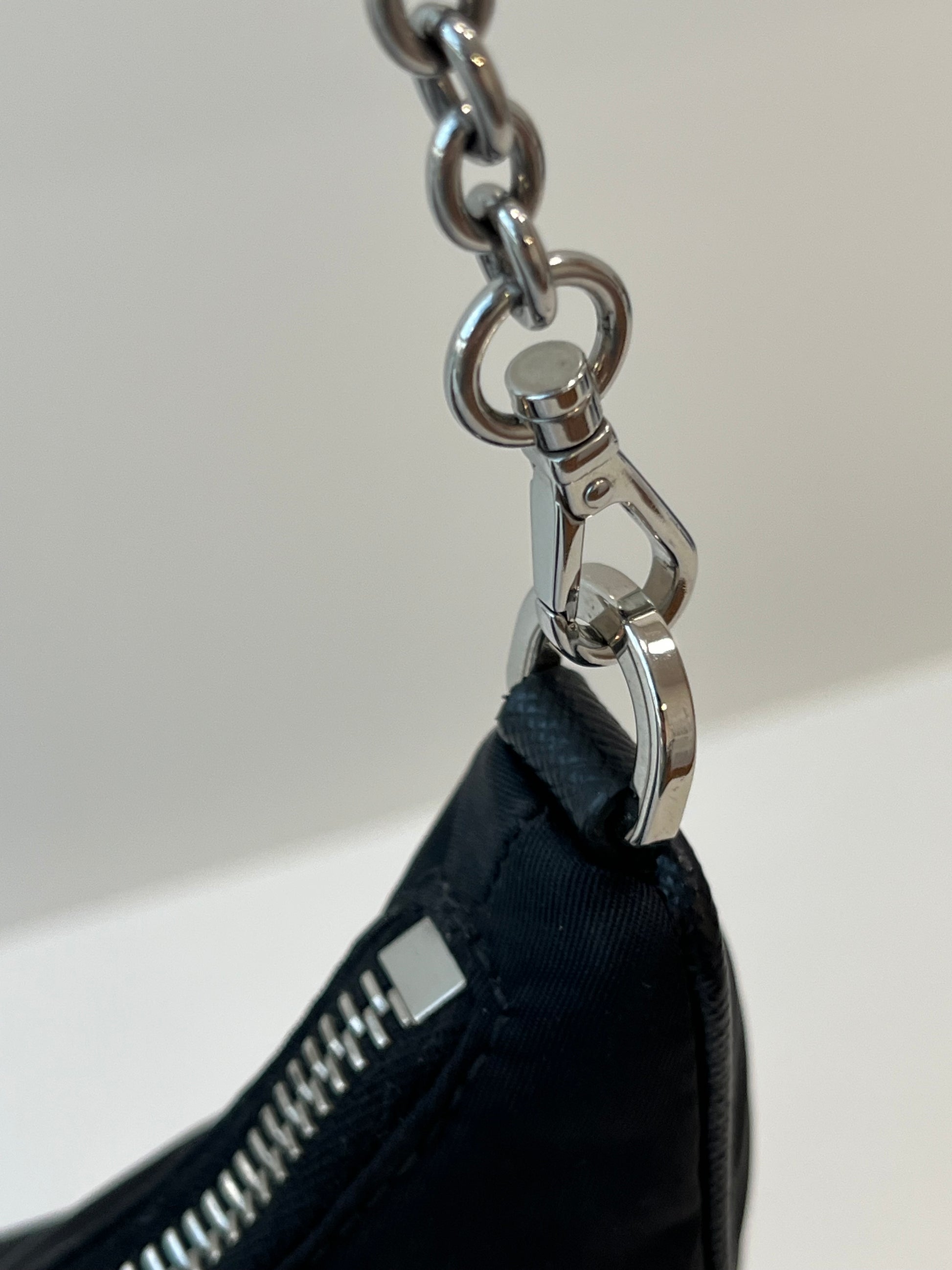 Prateadas, incluindo o icônico logo triangular esmaltado com “Prada Milano”.
