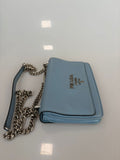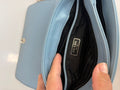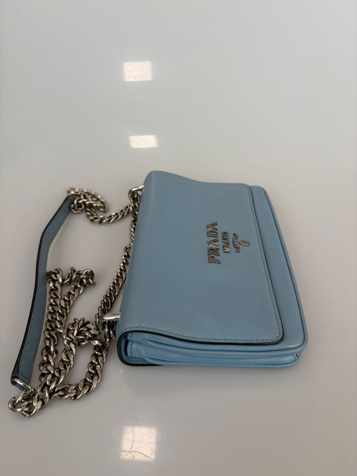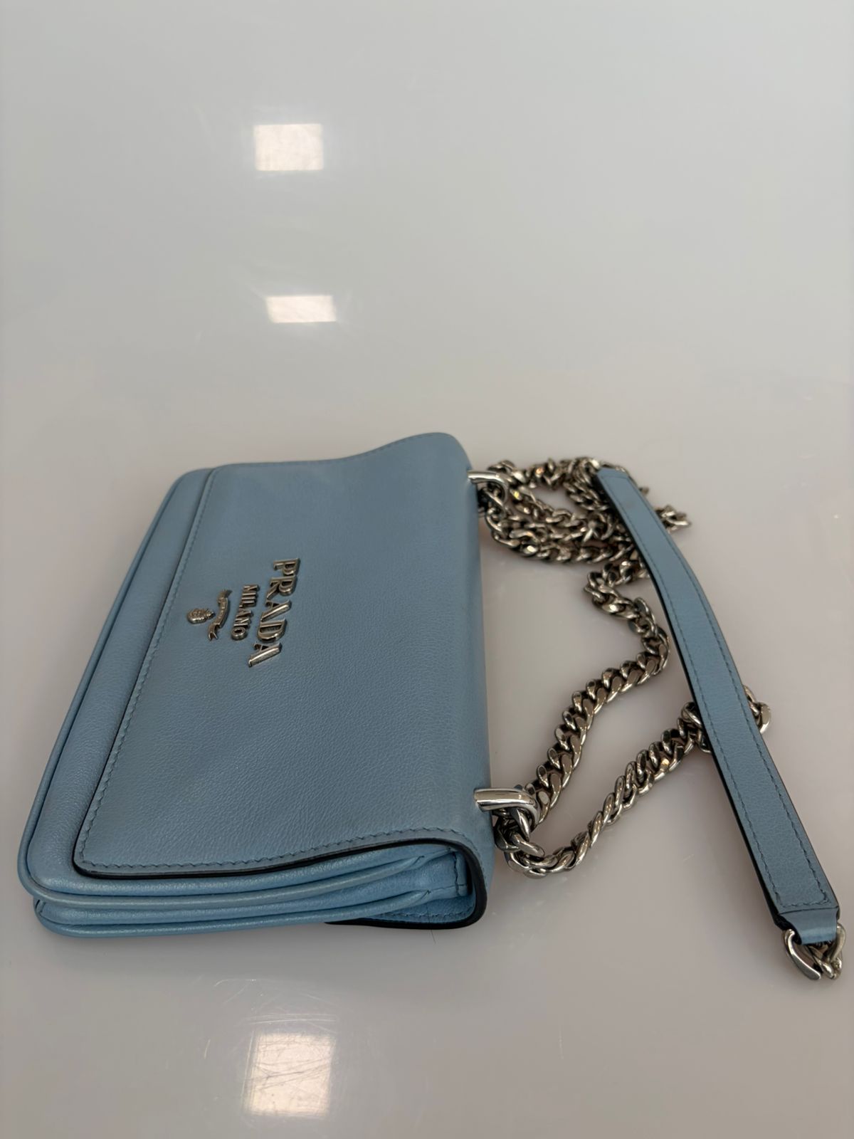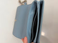 Alça longa em couro com trecho em corrente metálica prateada. Uso no ombro ou transversal