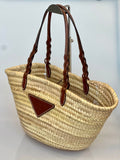 Duas alças de ombro em couro marrom trançado.