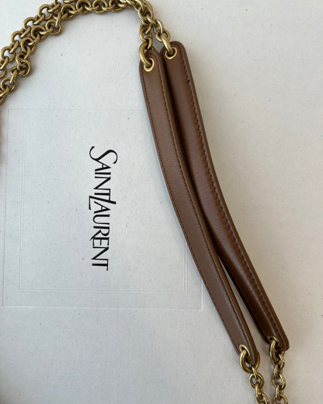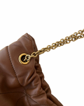 Excelente estado, praticamente novo. A bolsa apresenta sinais leves de uso nas ferragens douradas. O couro está macio e bem preservado, com a textura acolchoada intacta. Apresenta mancha visível no pouch.