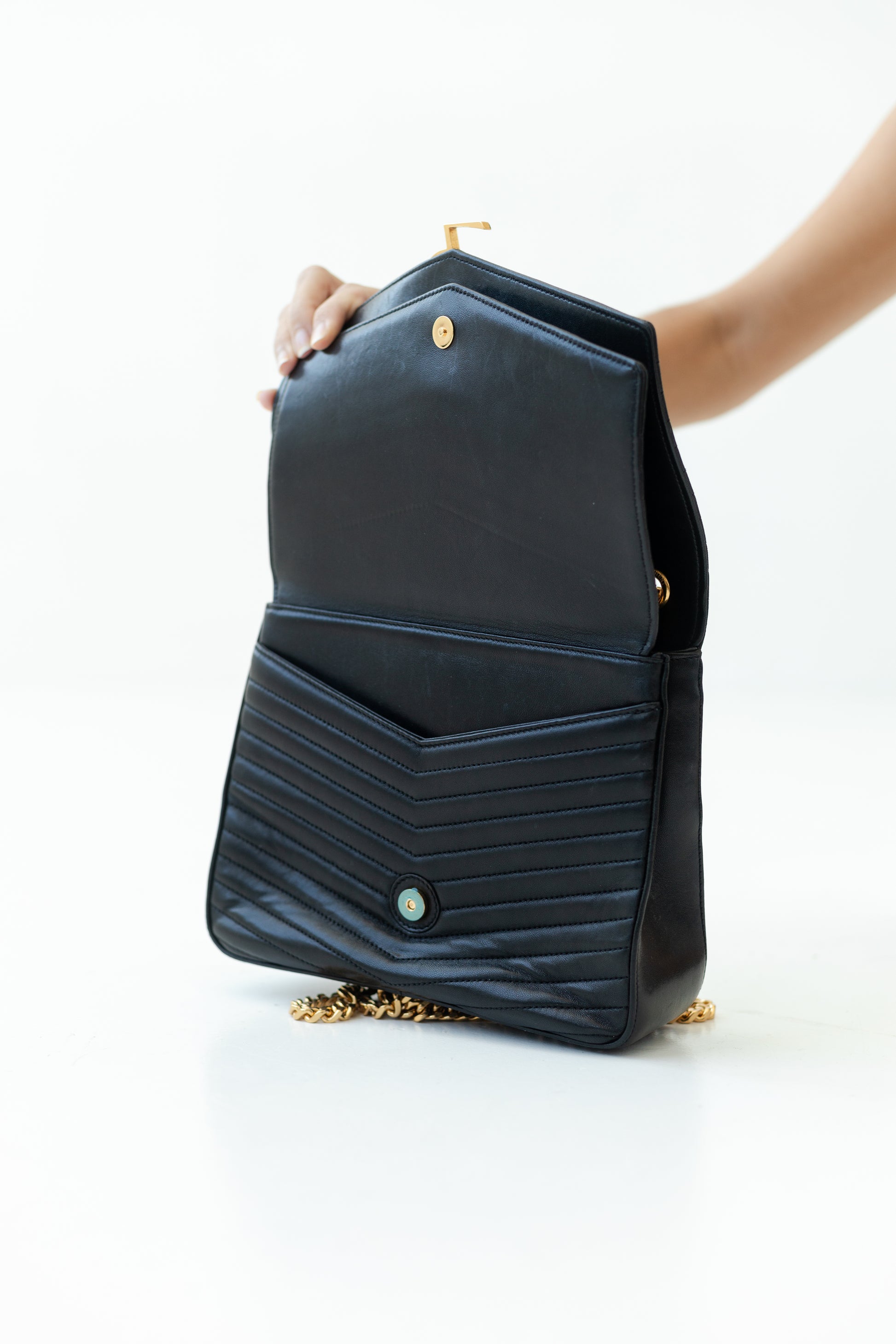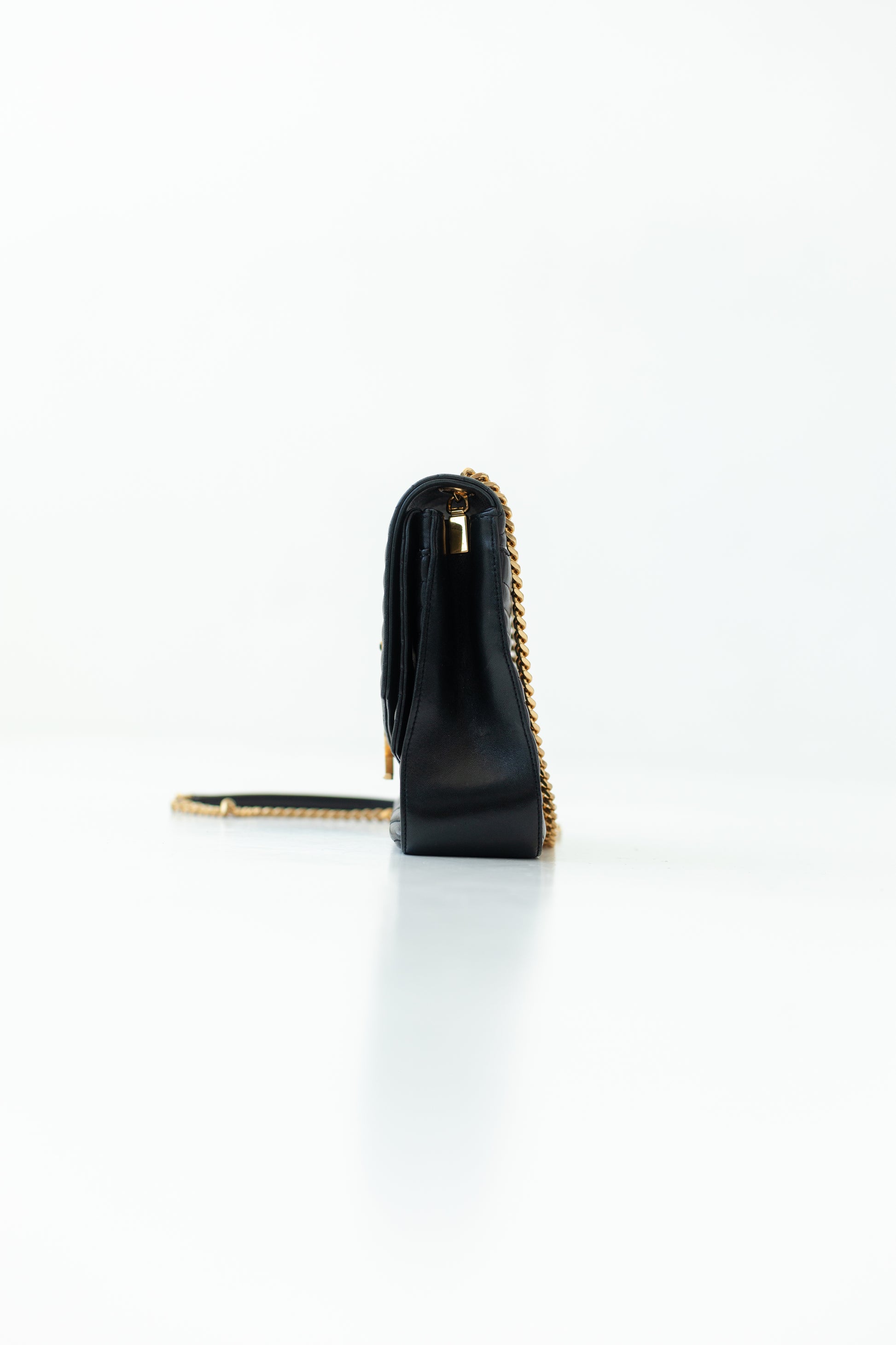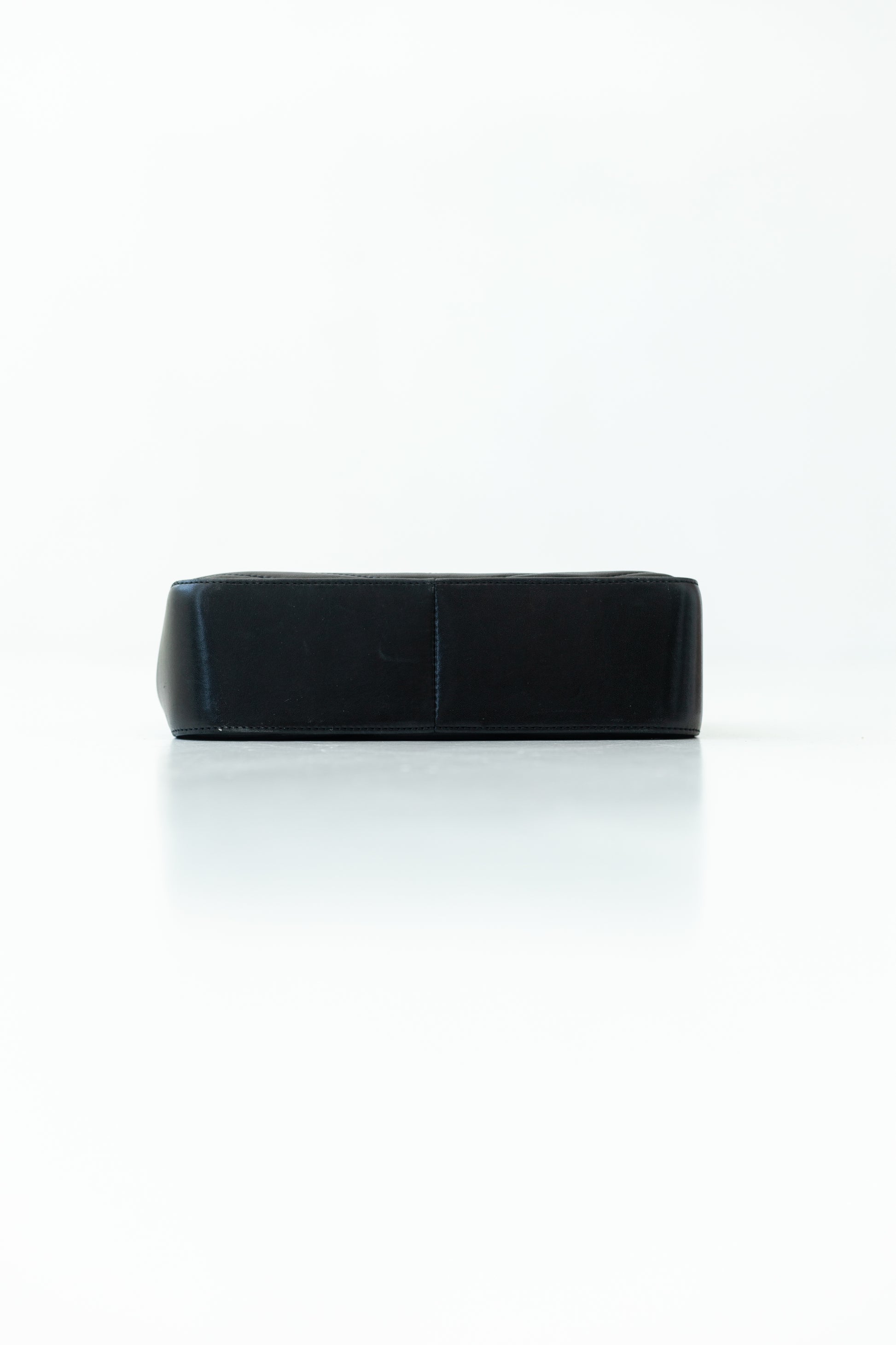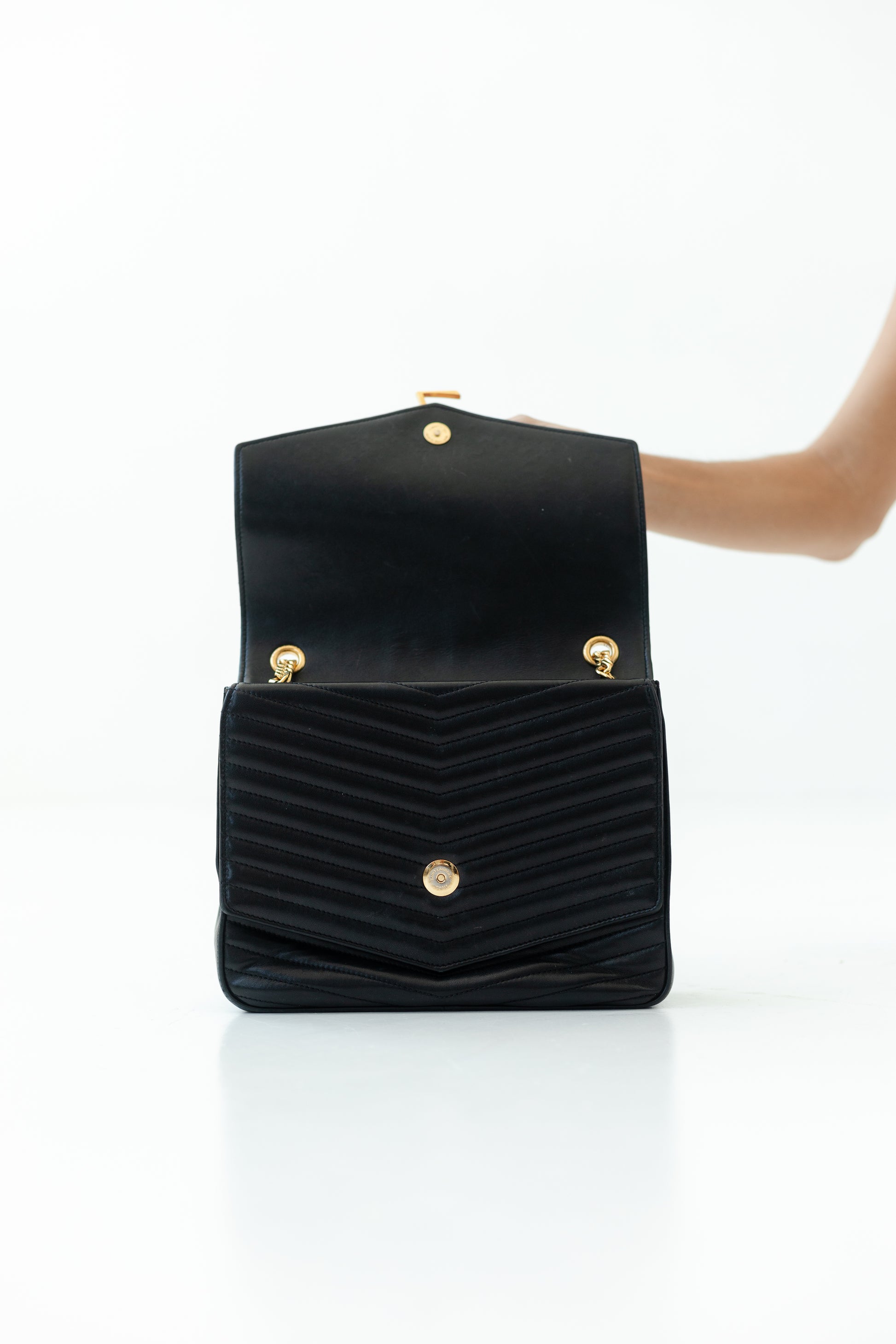 Couro calfskin preto com acabamento matelassê chevron Y e tira de couro na aba característica das Sulpice