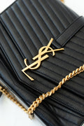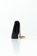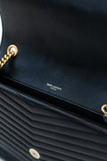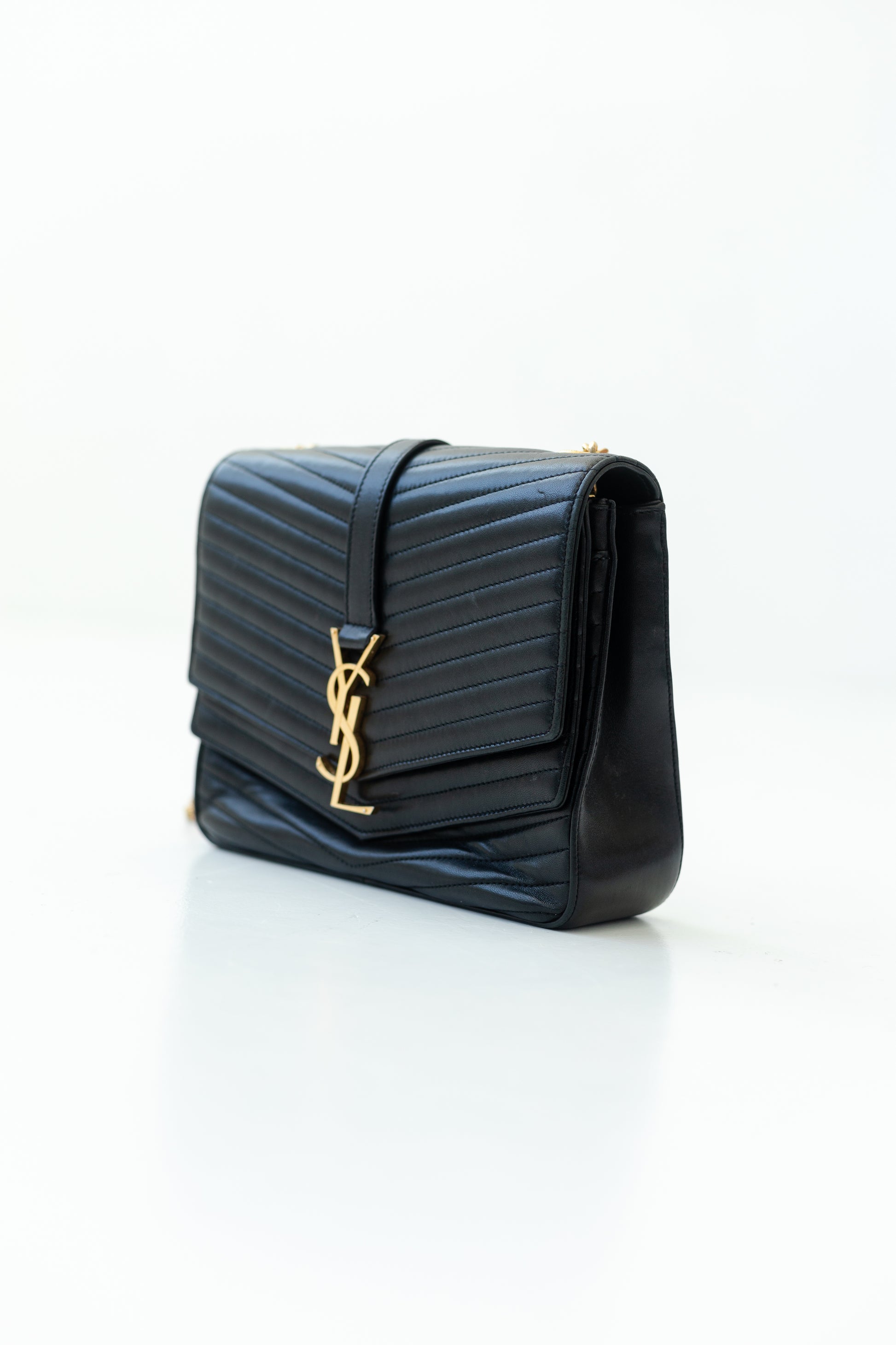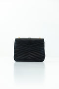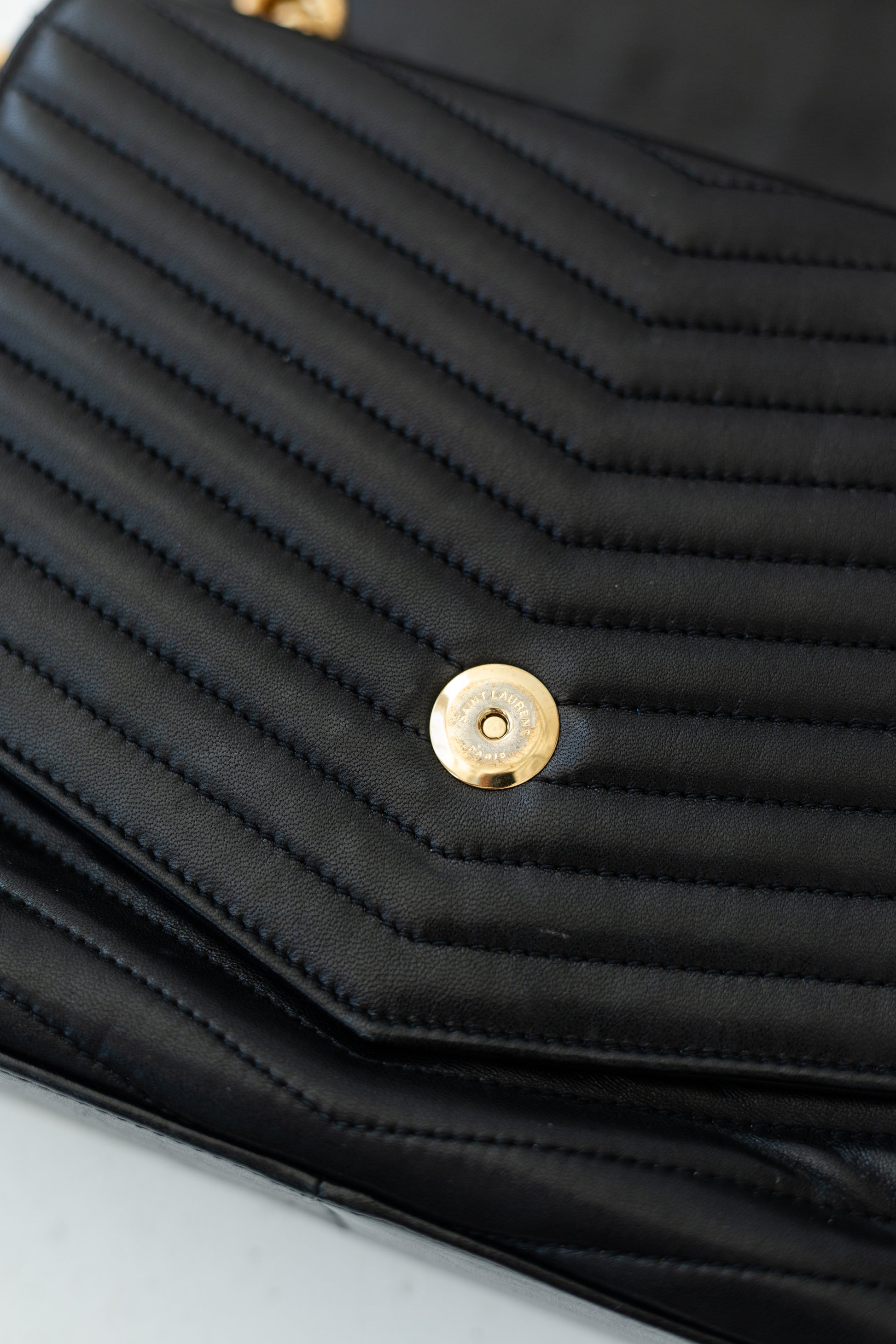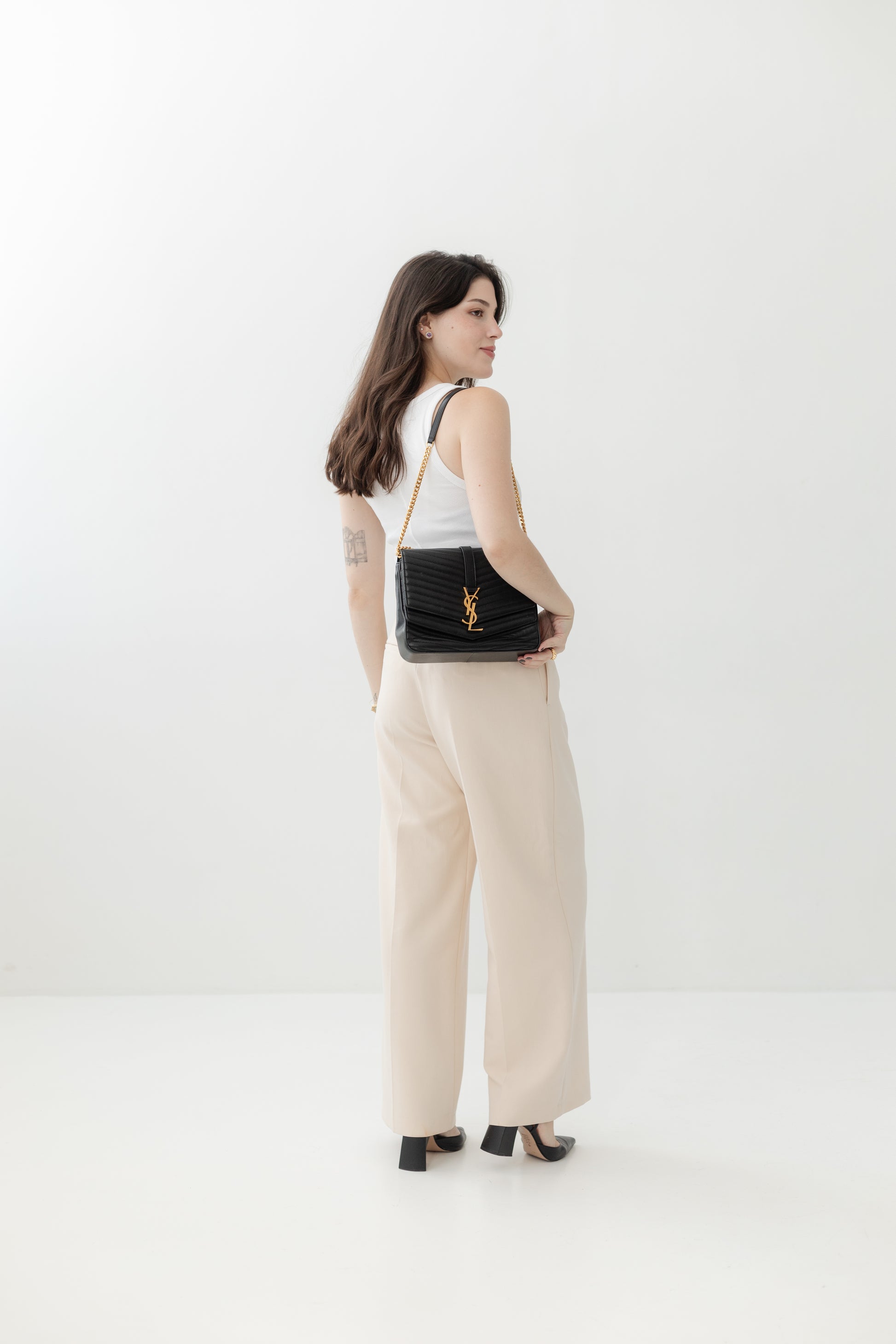 Couro calfskin preto com acabamento matelassê chevron Y e tira de couro na aba característica das Sulpice